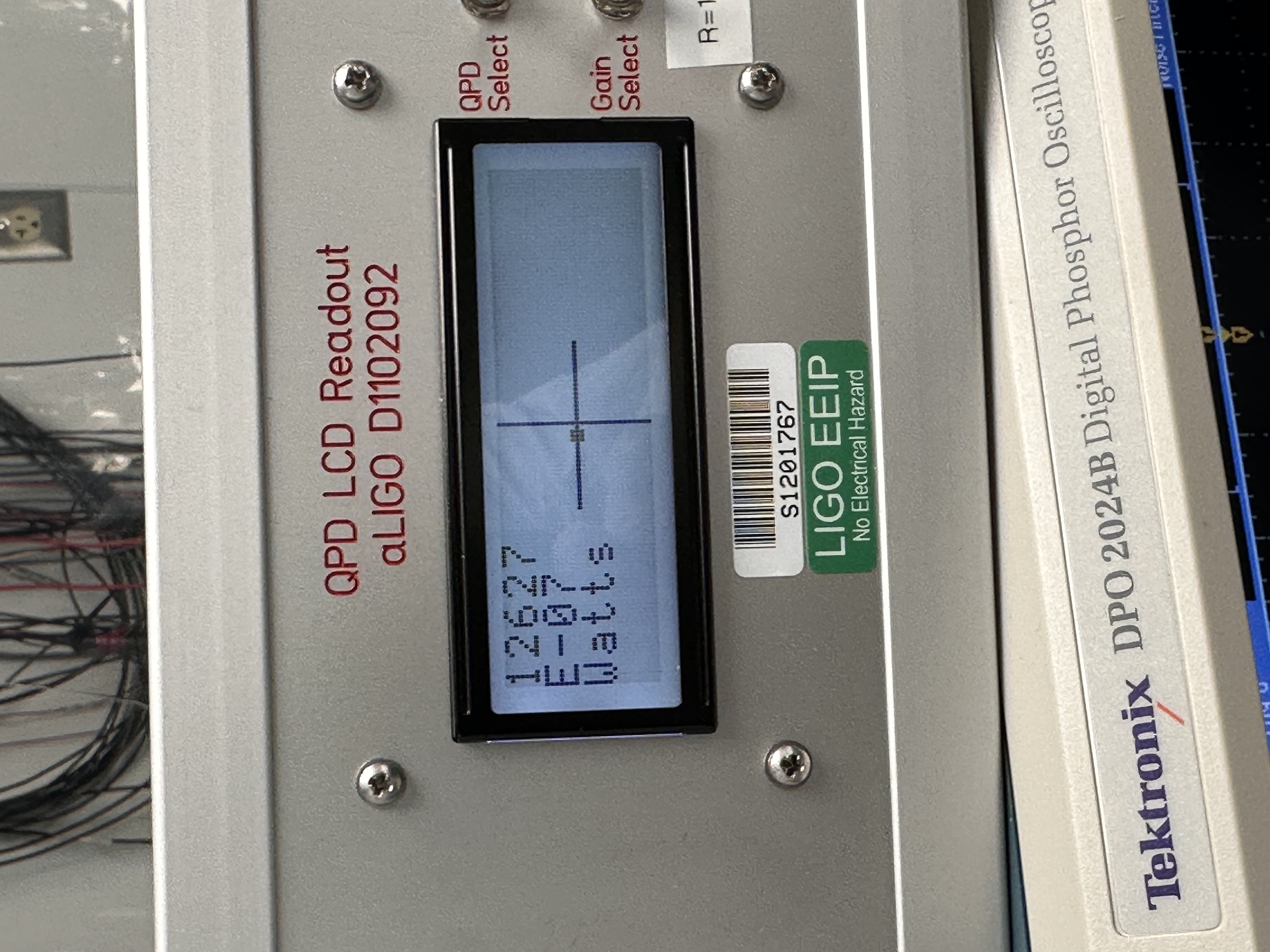 The alignment as of yesterday (Monday) was 143mm in pitch (as read out by the allen key in the PZT mirror pitch actuator wheel) and 0.4145 inches in horizontal translation as read out by the translation stage the PZT mirror sits on.