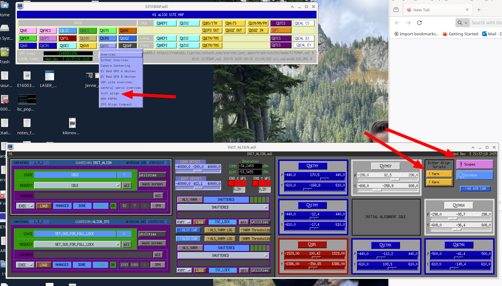 1. Start by using the baffle PD dither alignment script to set the TMS alignment: use the suspension guardians to misalign both ITMs and ETMs, run dither align script for both TMSs found on the INIT ALIGN MEDM, (dither align scripts, TMSX and TMSY, can run at the same time).  Open the ITM baffle PD scope and watch the script find the pointing of TMS that sets the beam to PD1, PD4, and finally centered on the optic.  When this finishes sucsesfully for both TMSs, there should be a dim green beam visible on both ALS cameras, if there is not check the alignment of PR3 (affects both arms) and the BS (only moves the Y arm beam).  This TMS alignment has to be set before you can move onto the next step, otherwise the ITM alignment won't be right.