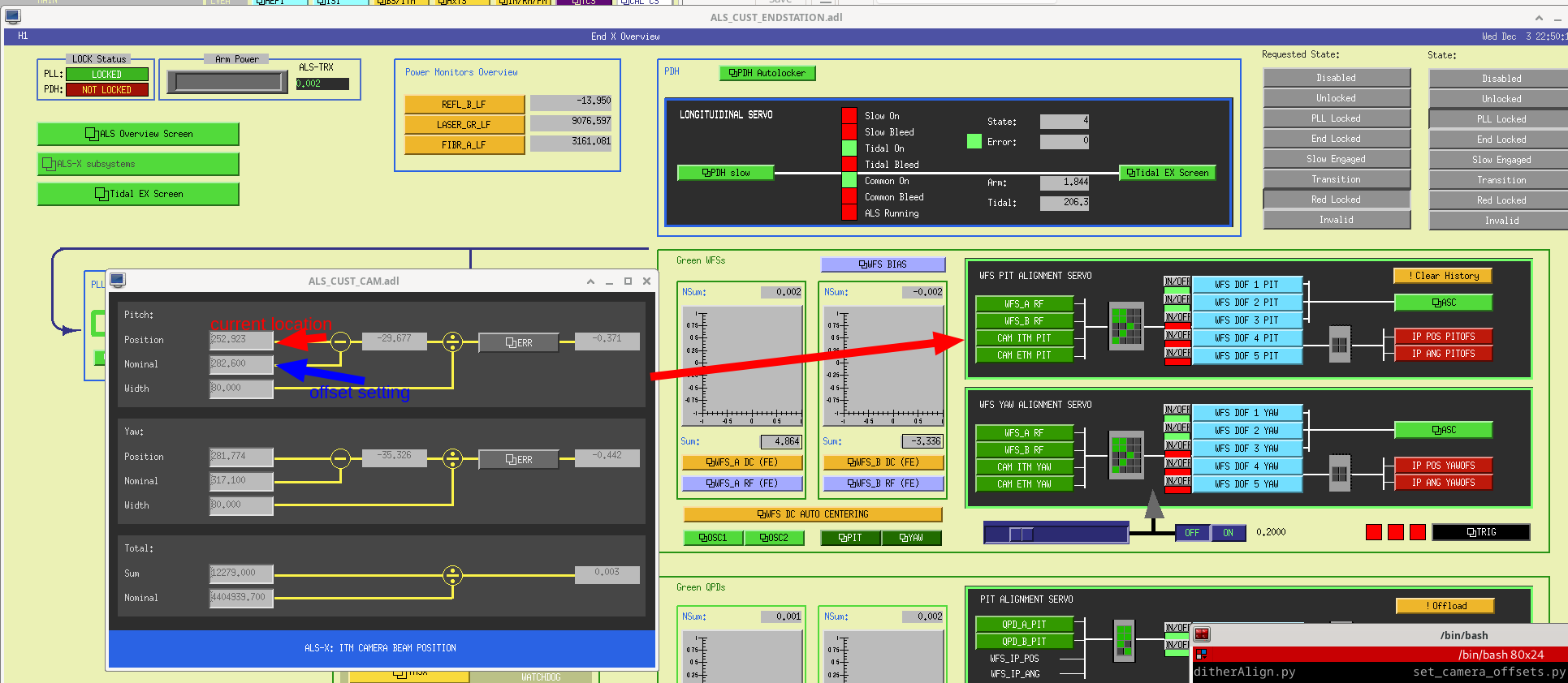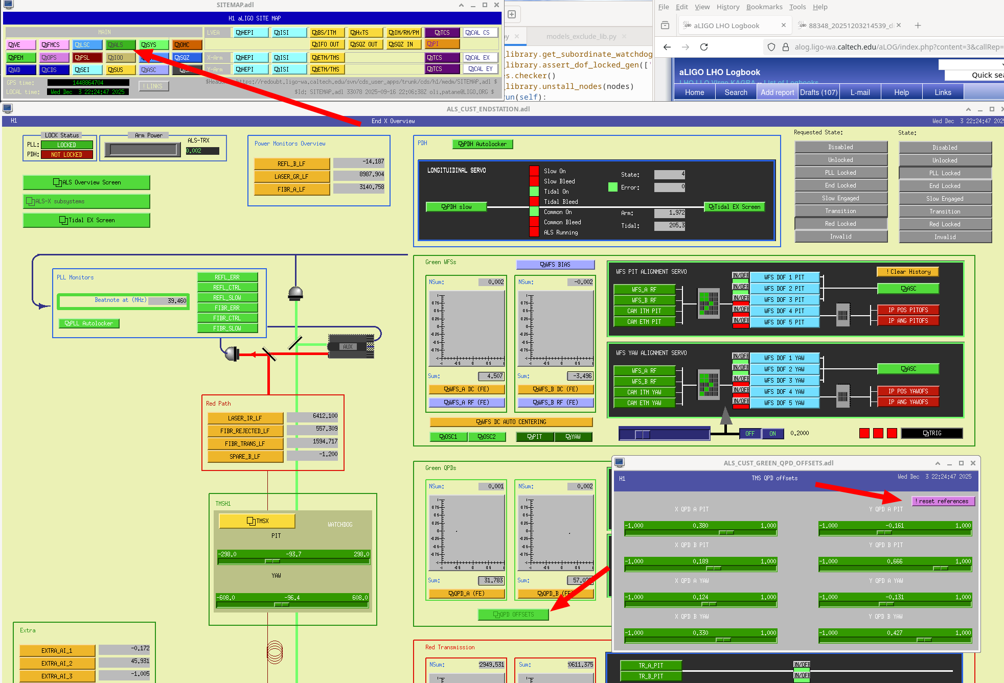 1. If you are adjsuting alignments by hand, you want to keep the green beams locked to the arms as the alignment changes.  To get the green alignment to follow any changes you make, stop at IDLE_ALS and turn on the scripts that servo the green TMS QPD offsets based on the green WFS.  You can access this script by going to either ALS end station overview and clicking the button that says QPD OFFSETs, then using the pink drop down button to start the servo for each arm, and open the ndscope that lets you watch the progress of these servos (screenshot)