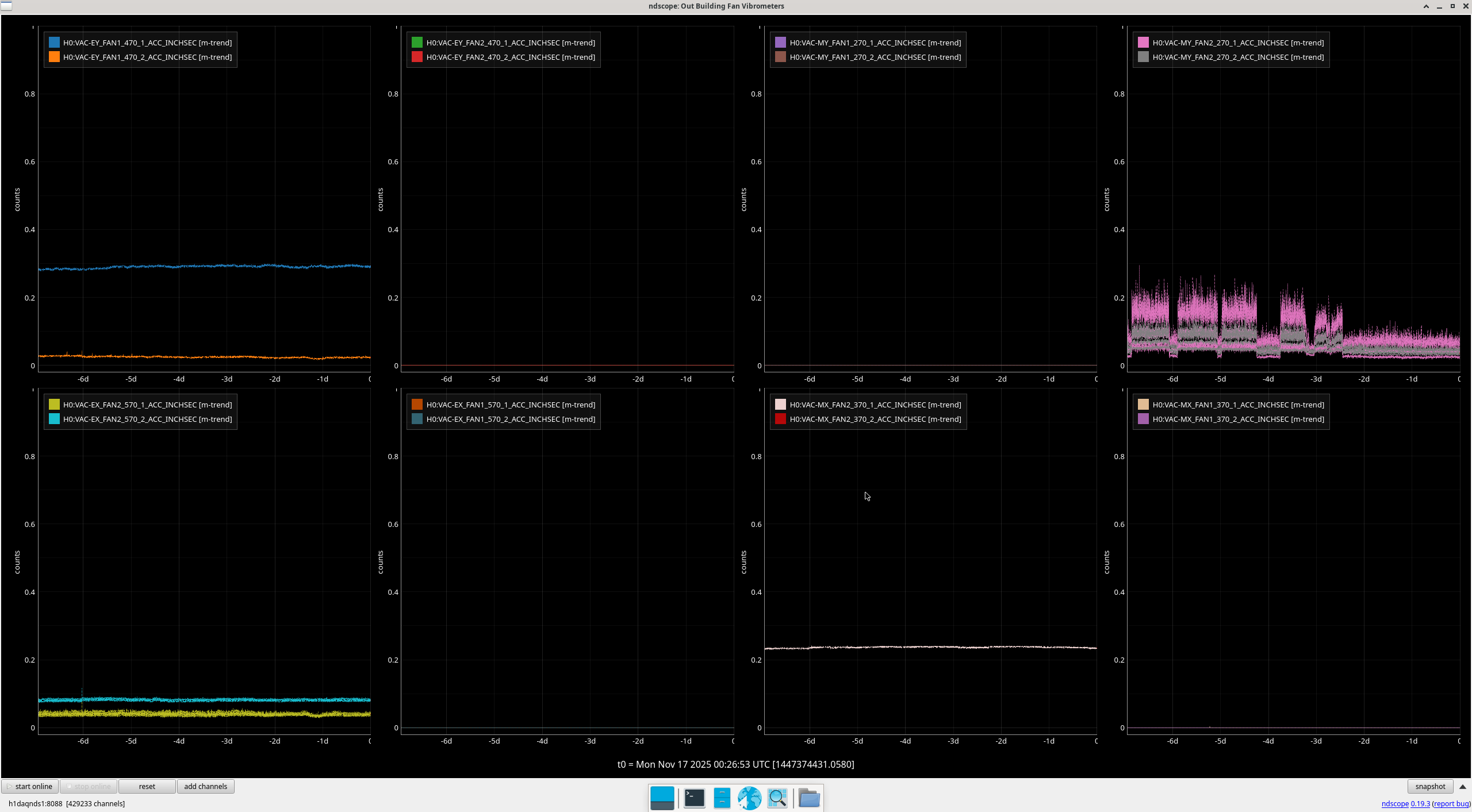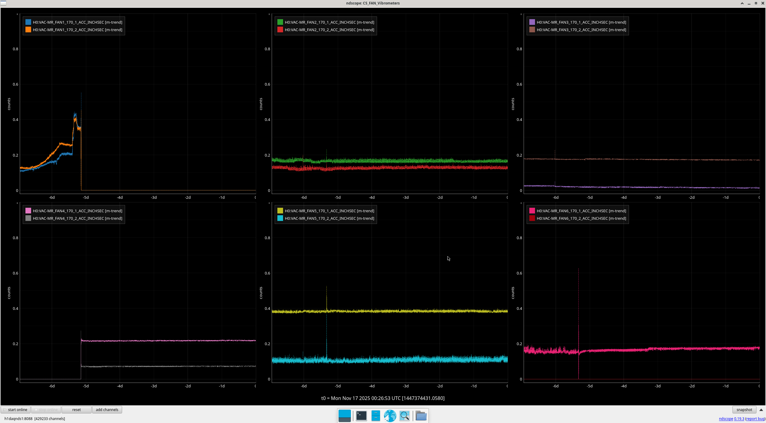 MR_FAN1_170_1 and MR_FAN1_170_2 were increasing rapidly and approaching the cutoff of 0.7, but it appears they were turned off last Tue during maintenance (Ryan C reports that he and TJ saw this and told facilities). This was also reported in the last FAMIS alog for these fans. Counts are 0 for this plot.