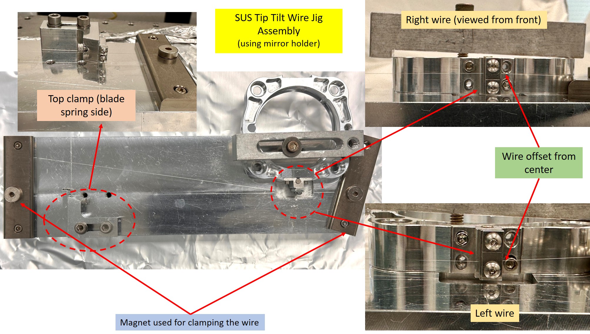 Wire pulling jig (D1100735_V1) - we faced some issues when we tried using the wire pulling jig - issue captured in this document. I have handed over D1100732 to Tyler for re-work. However, this was not a show stopper as TJ showed us how it was done before (see LLO alog 36765, Nov 2017) and we recreated it - see here for details (using mirror holder with the bottom wire clamp). Also, we have created the intentional wire offset (to compensate for the heavy optic pitching up) on the wire clamps to counterbalance the optic. We have also used a bigger pitch adjuster to give us more dynamic range.