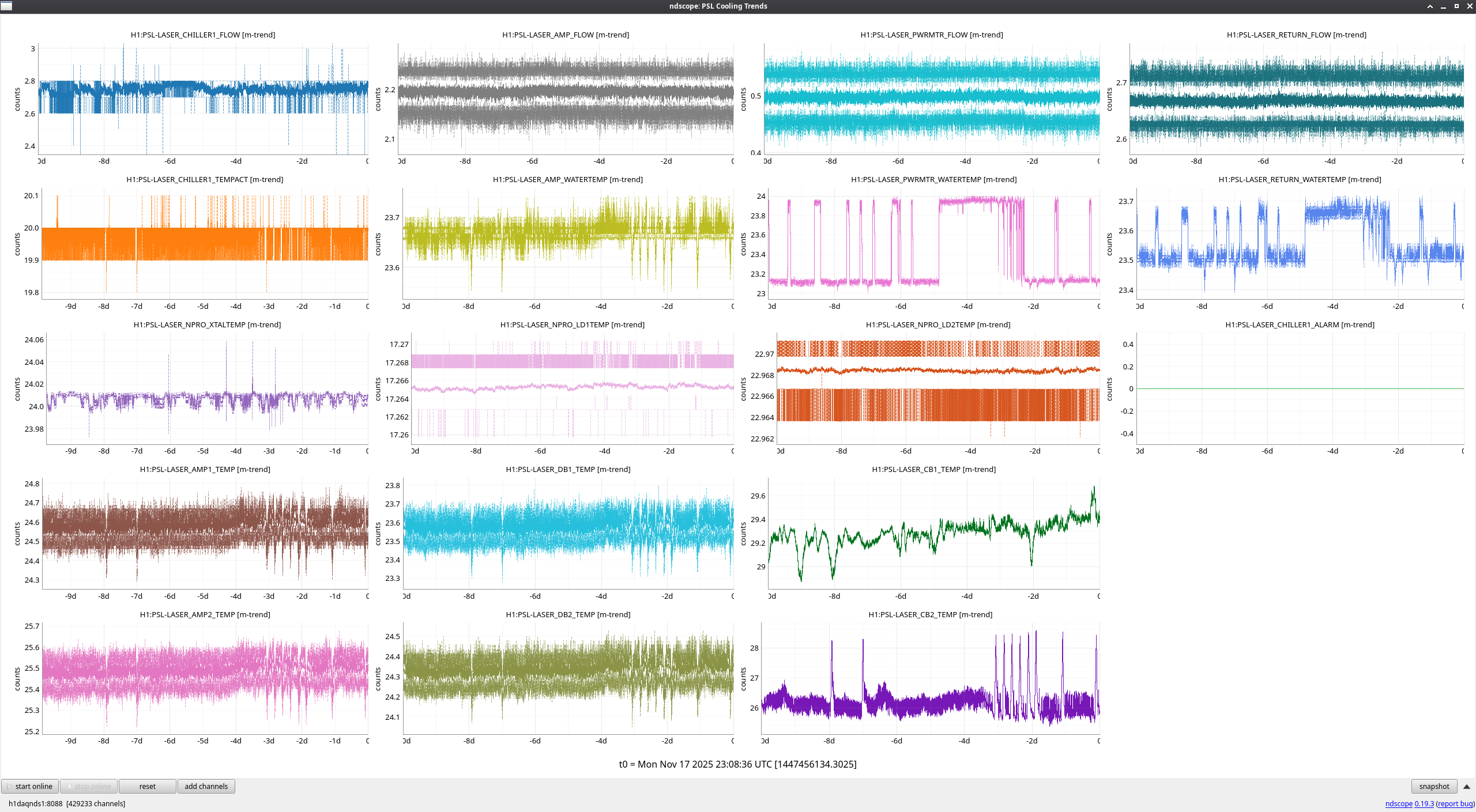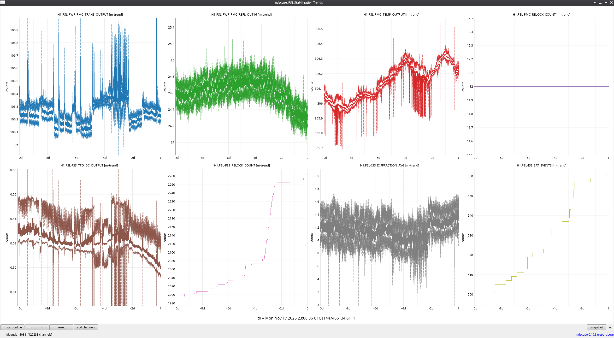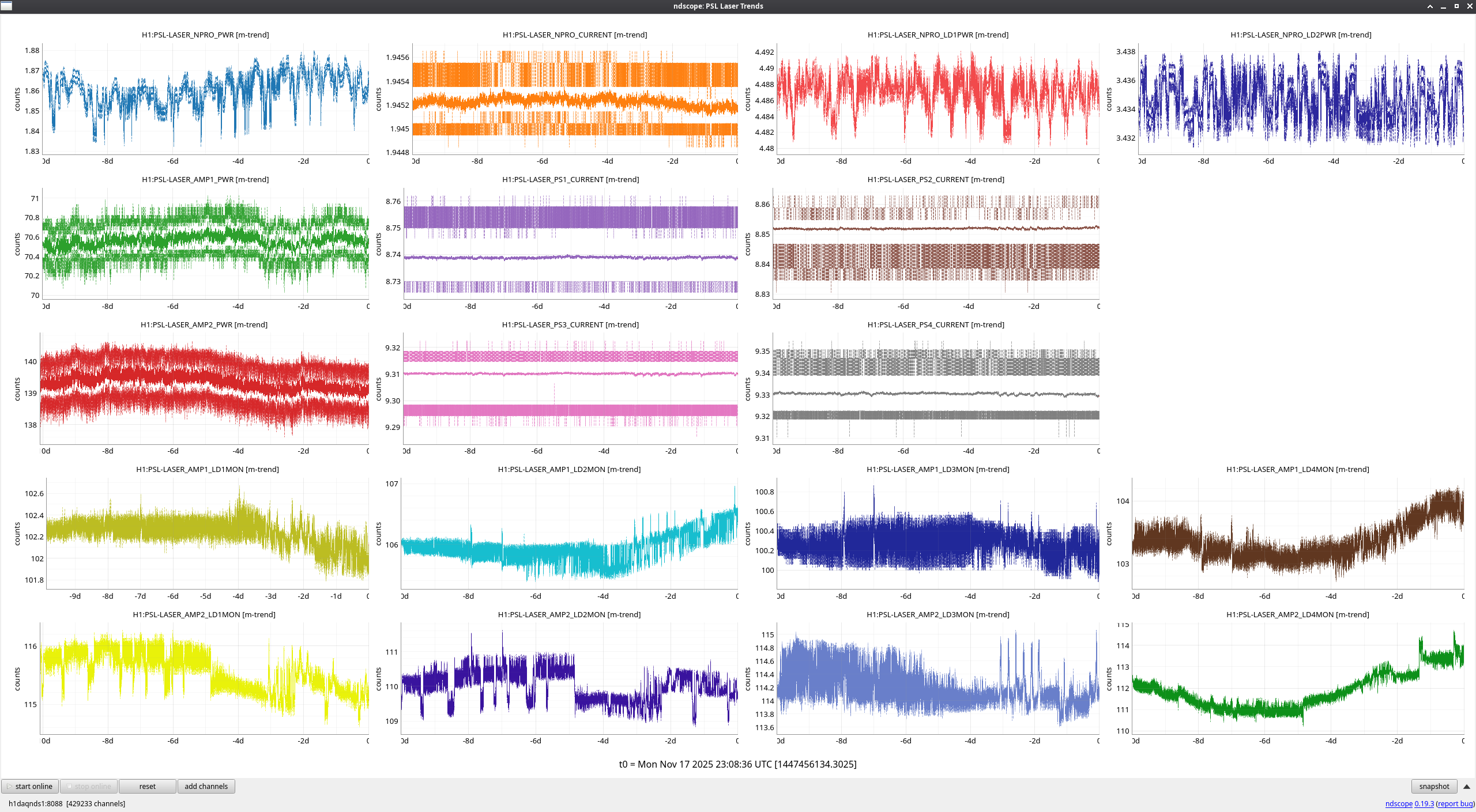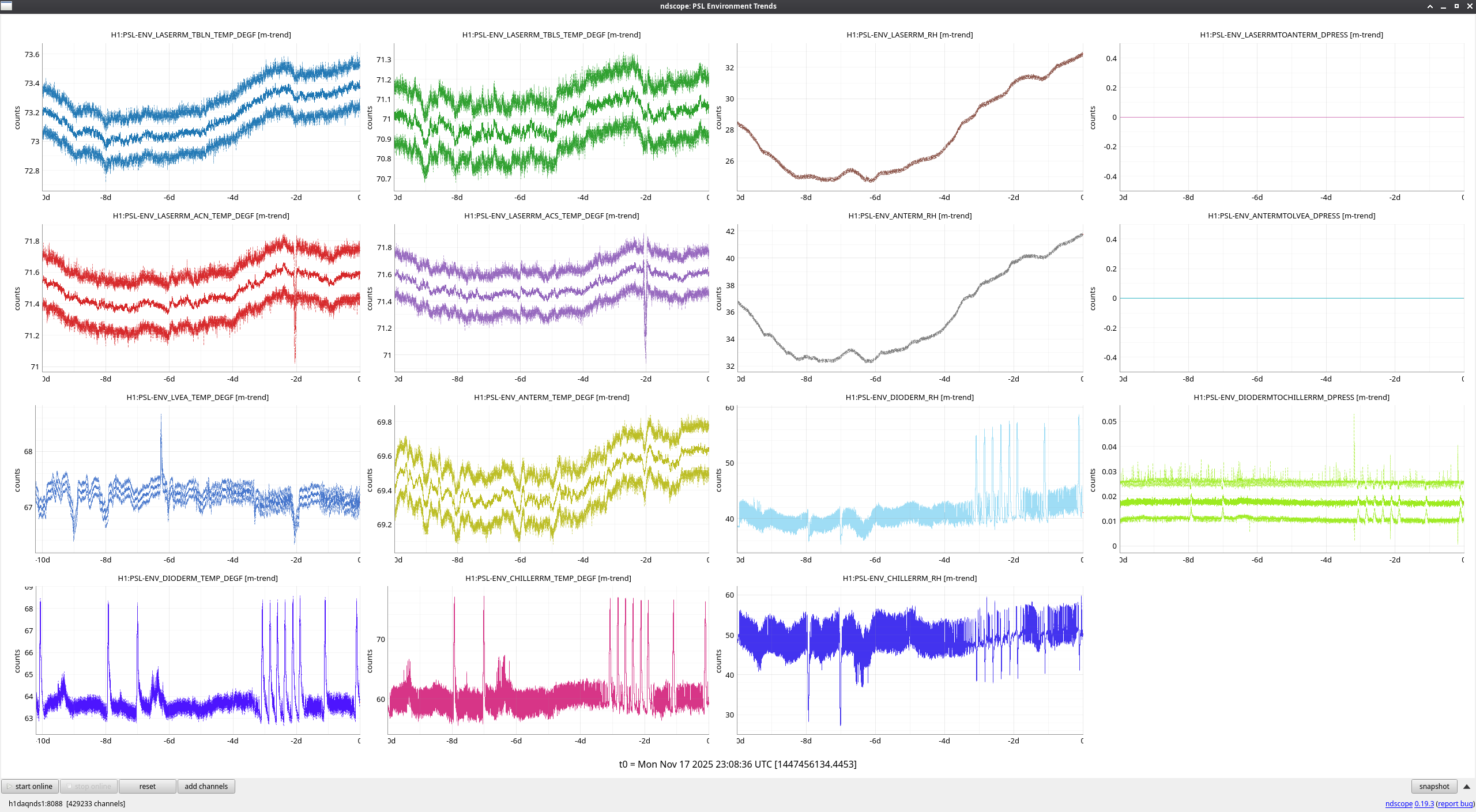 Between 2 and 3 days ago, there were some quick temperature spikes seen in the diode and chiller rooms, which seem to have propagated through to the diode boxes, amplifiers, some pump diodes, and eventually the PMC power. Not sure what caused this or if we've seen them before, but these jumps appear to have stopped and things are running smoothly.