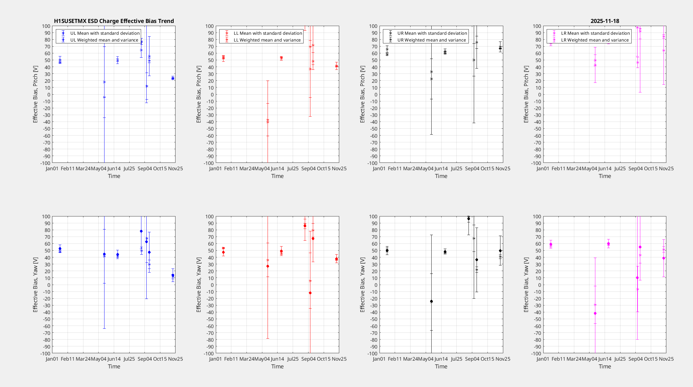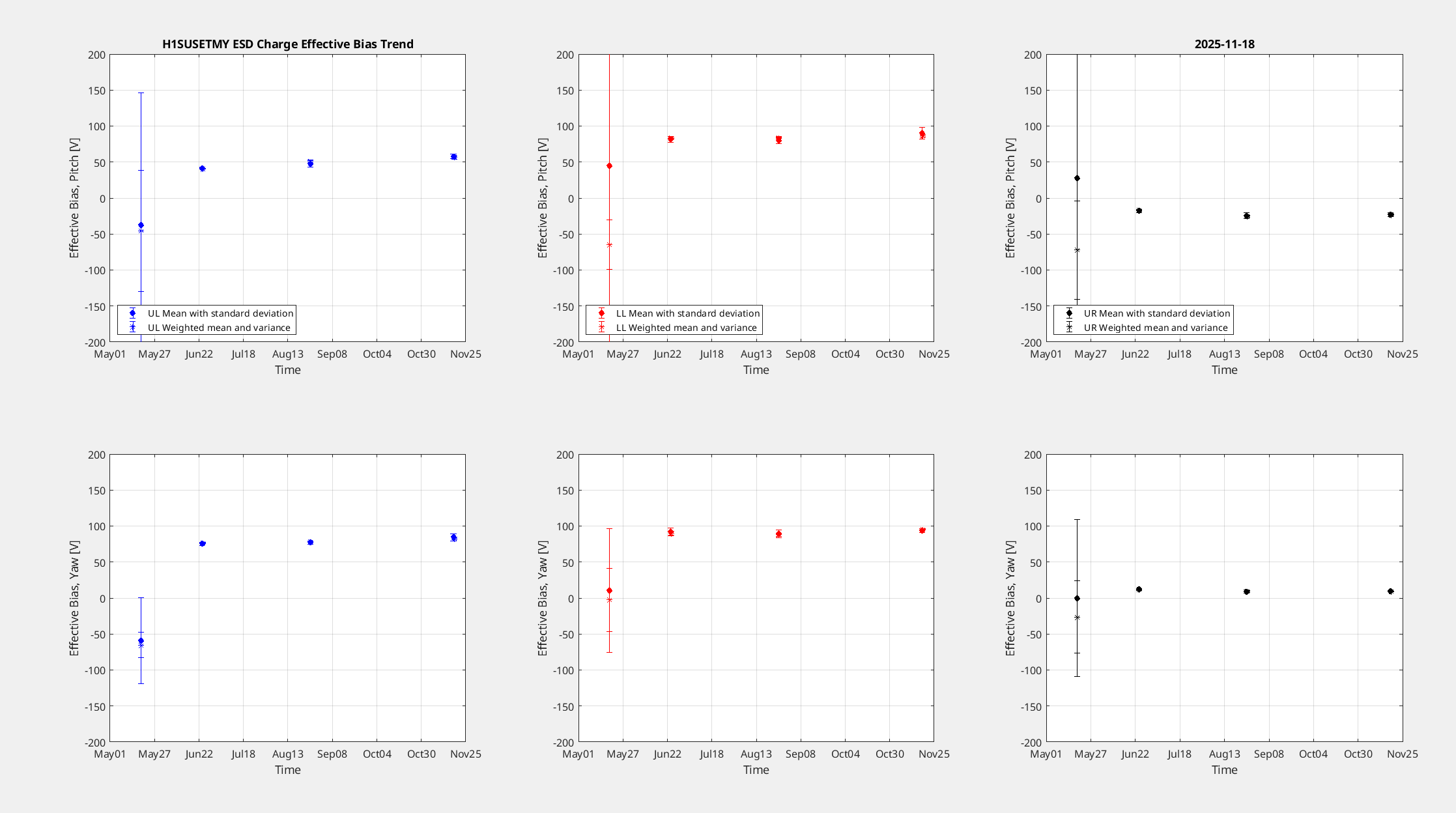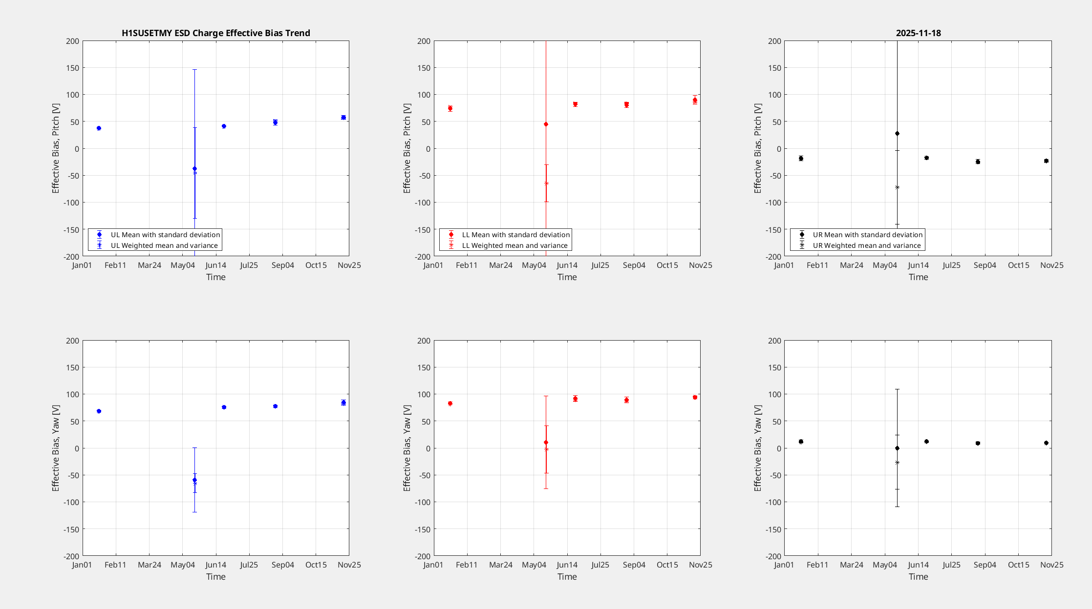 ETMY also initially had some saturations but reducing the gain by 20% stopped them and still yielded good coherence. ETMY's charge is slightly high, it's just under + 100 [V] on 2/3 of the quadrants, UR is the only quadrant below +/- 50 [V], it has risen since May, but zooming out to the whole year it doesn't look to have much of a trend, May wasn't a great measurement.