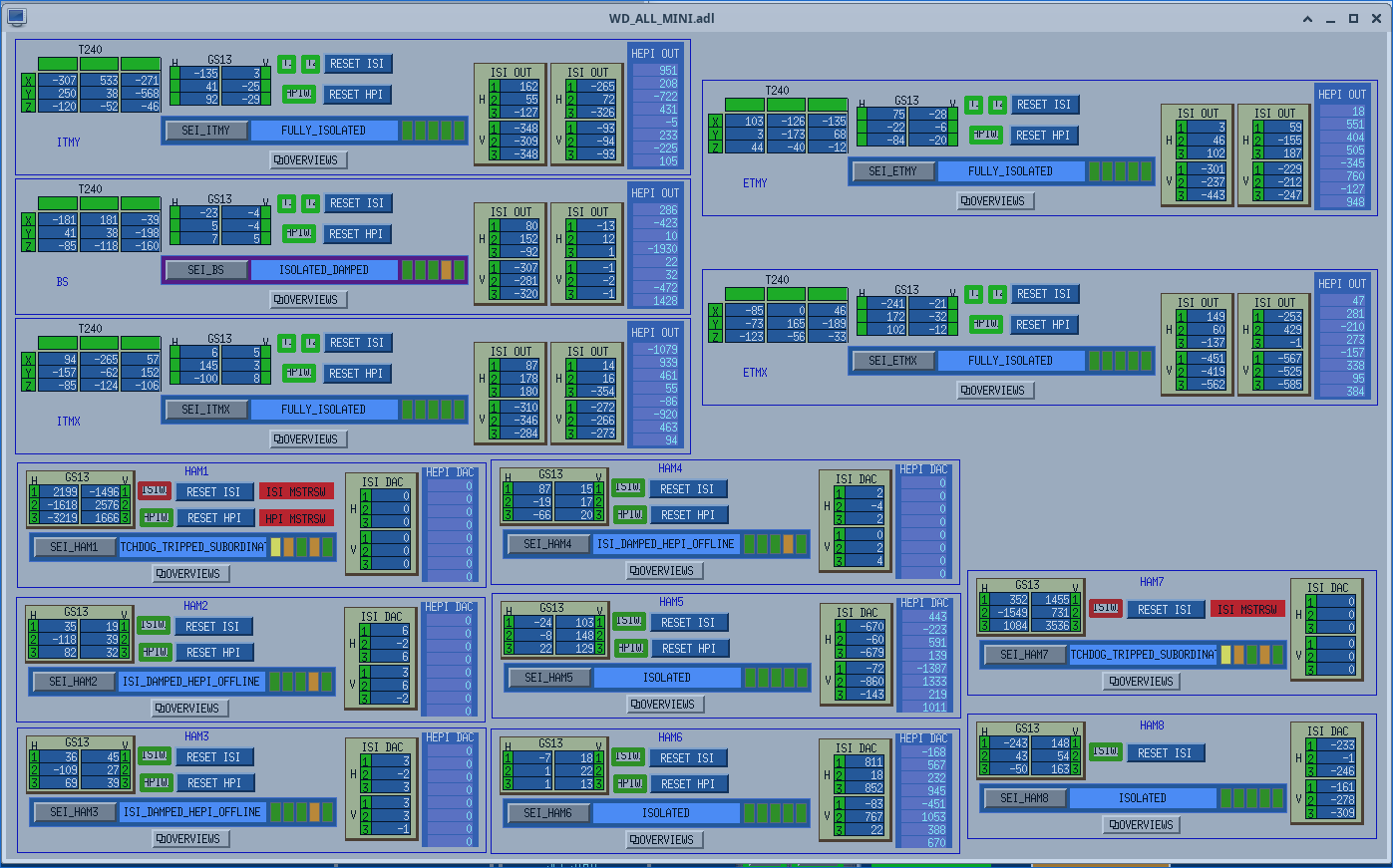 There were some SEI trips earlier today due to an earthquake. Dave went in and reset the software WDs earlier (88671), so to get the system back up to where it was before the earthquake, I went through and reset ISI and HPI to nominal for the chambers that needed them reset (aka not resetting them for the systems where we already have them down due to venting). Tony's overview and WD screenshots from Wednesday are a good reference for what state everything was in before the earthquake. This is what the OPS Overview looked like before I started resetting everything. Everything now that needed to be reset is back how it was before the earthquake (overview now).