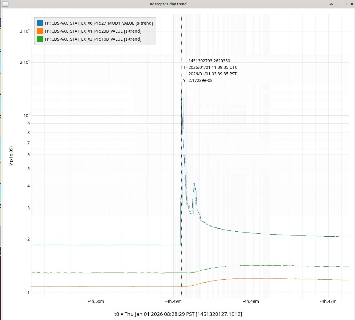 Pressure trend shows the pressure at PT527 increased from its baseline of 1.9e-09 to a max of 1.4e-08 Torr. Several seconds later the EX gauges showed a minimal increase when the dispersed molecules reached them.