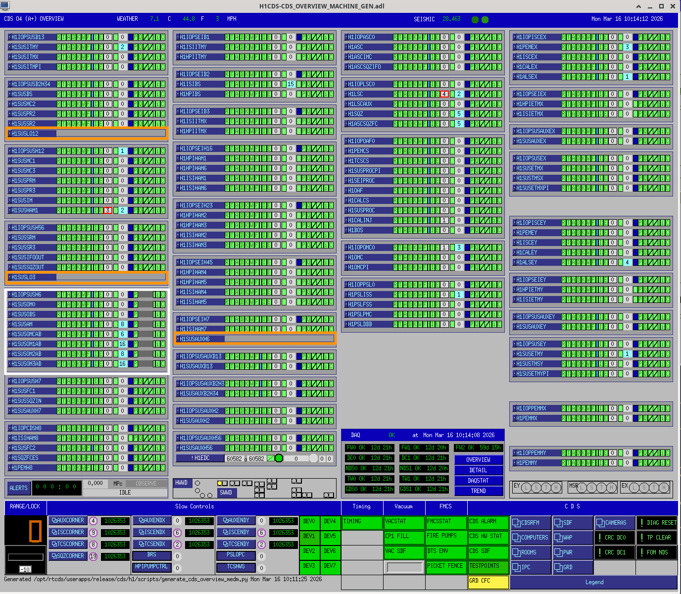 The new h1sush6 front end, highlighted in WHITE, is not currently in the DAQ, hence the grey'ed DAQ status.