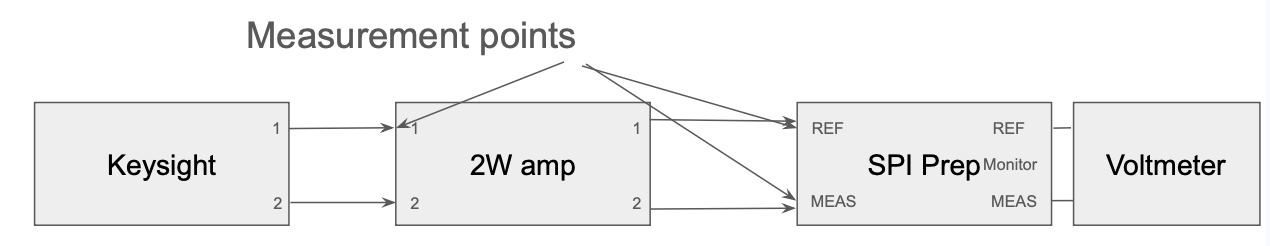 I measured the power at 2 points in the chain from Keysight -> 2W -> SPI prep, for both channels. (SPI_Build_RF_Diagram.png) The first point is just before the 2W amp, and the second point is just before the SPI prep for both channels. Then I compared that with what the output monitor voltage was showing on SPI prep for both channels.