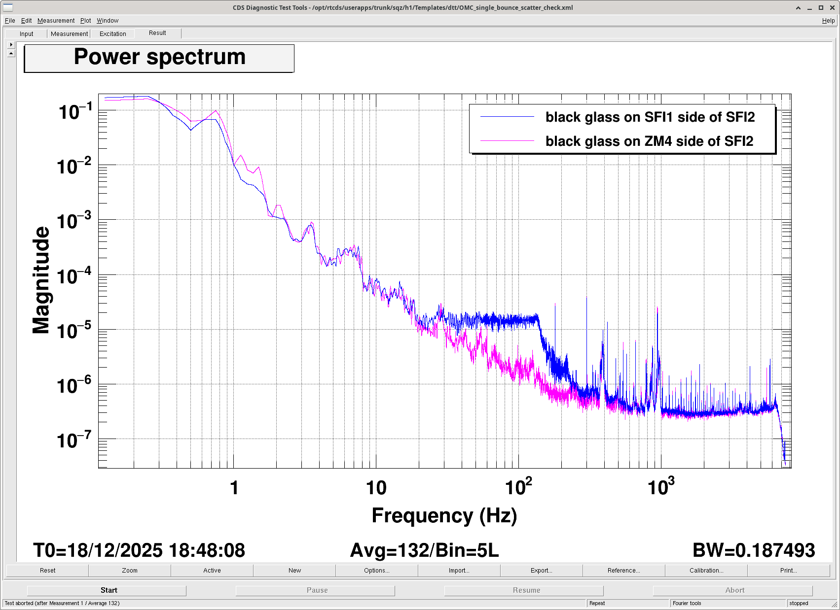 However, the Qs that were needed seemed too high because Corey and I had tried to damp these (39156), and the only evidence that the source was the baffles was the low resonant frequency, consistent with the measured frequency of input arm MC baffles. But the low frequency resonance might also be a resonance of the vacuum enclosure itself, so I decided to get the Qs and resonant frequencies from the baffles directly, using a laser vibrometer. I found that The MC (eye) baffle by HAM5 has a resonance of 12.1 Hz, the MC Baffle by HAM4, at 13.3 Hz, and the SR tube has a resonance at 14 Hz. Thus, based on the 13.2 and 14.2 Hz frequencies that made the original model reproduce DARM noise, the likely source of the scattering noise is the eye baffle by HAM4. Using the measured Qs, resonances, and a simplified mechanical transfer function from the permanent accelerometer that was present when I did the original sweep to an accelerometer that I mounted last week right outside the baffle, I got the results shown in Figure 4 (the permanent accelerometer I used for Figure 3 underestimated tube motion at the location of the baffle which was why I had to use such high Qs - the measured Qs were 5 and 10, more consistent with our damping). The predicted level of noise in DARM for ambient vibration levels in Figure 4 is slightly lower than the more naive model of Figure 3, getting as close as a factor of 3 below the current noise floor in the 80-200 Hz region.
