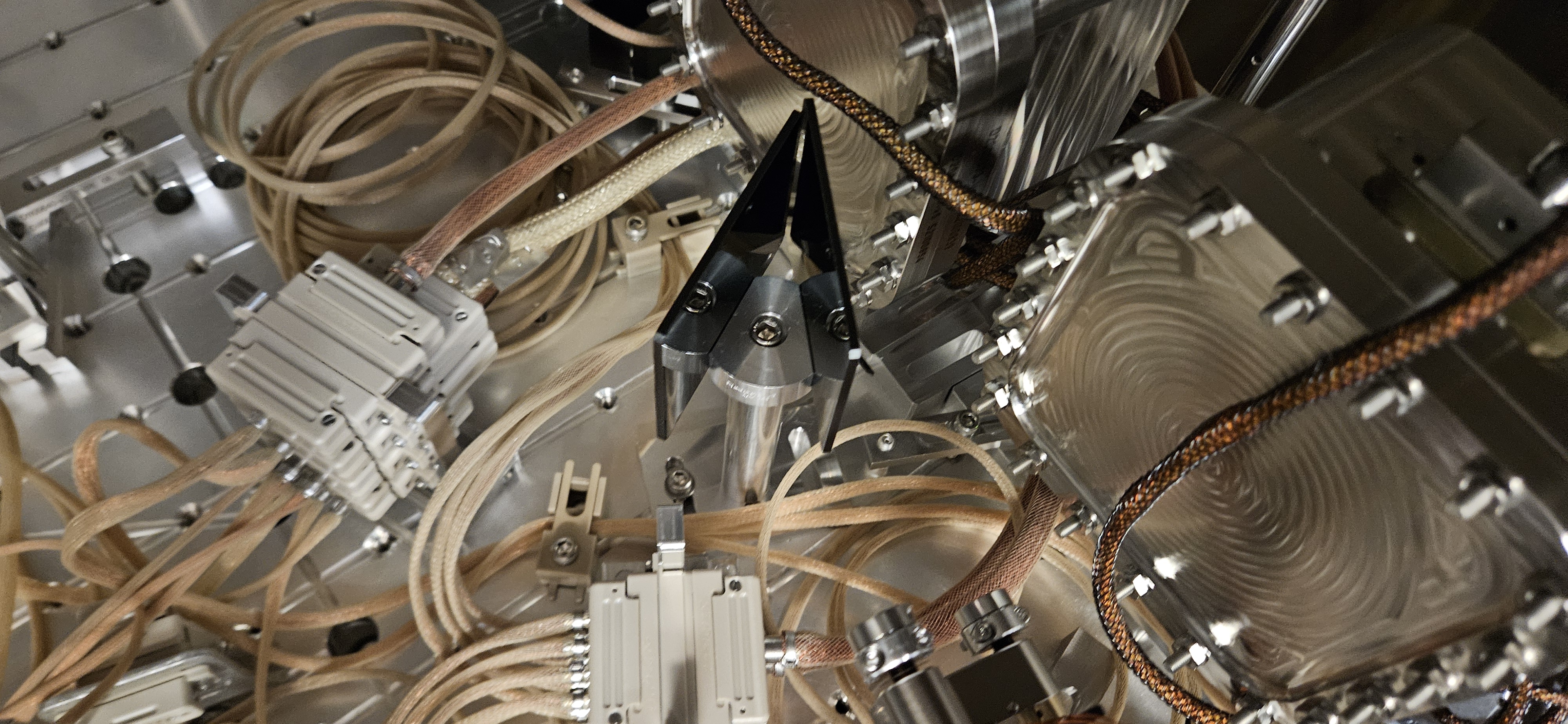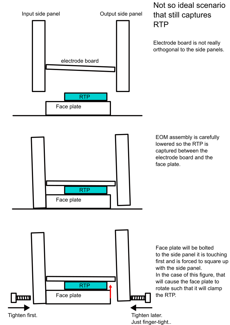 The four SMA cables were connected to the SMA elbow connectors on the EOM. The strain relief posts appear to be designed such that each cable is sandwiched between the two viton pieces, with one screw above and one screw below. I was a bit confused about how exactly to use the screws with hex nuts attached. I instead used the third bottom screw to loosen to slide the cable in, and then tighten. It was helpful to have someone else pinch the viton at the top while I tightened the screw. This is how it looks.