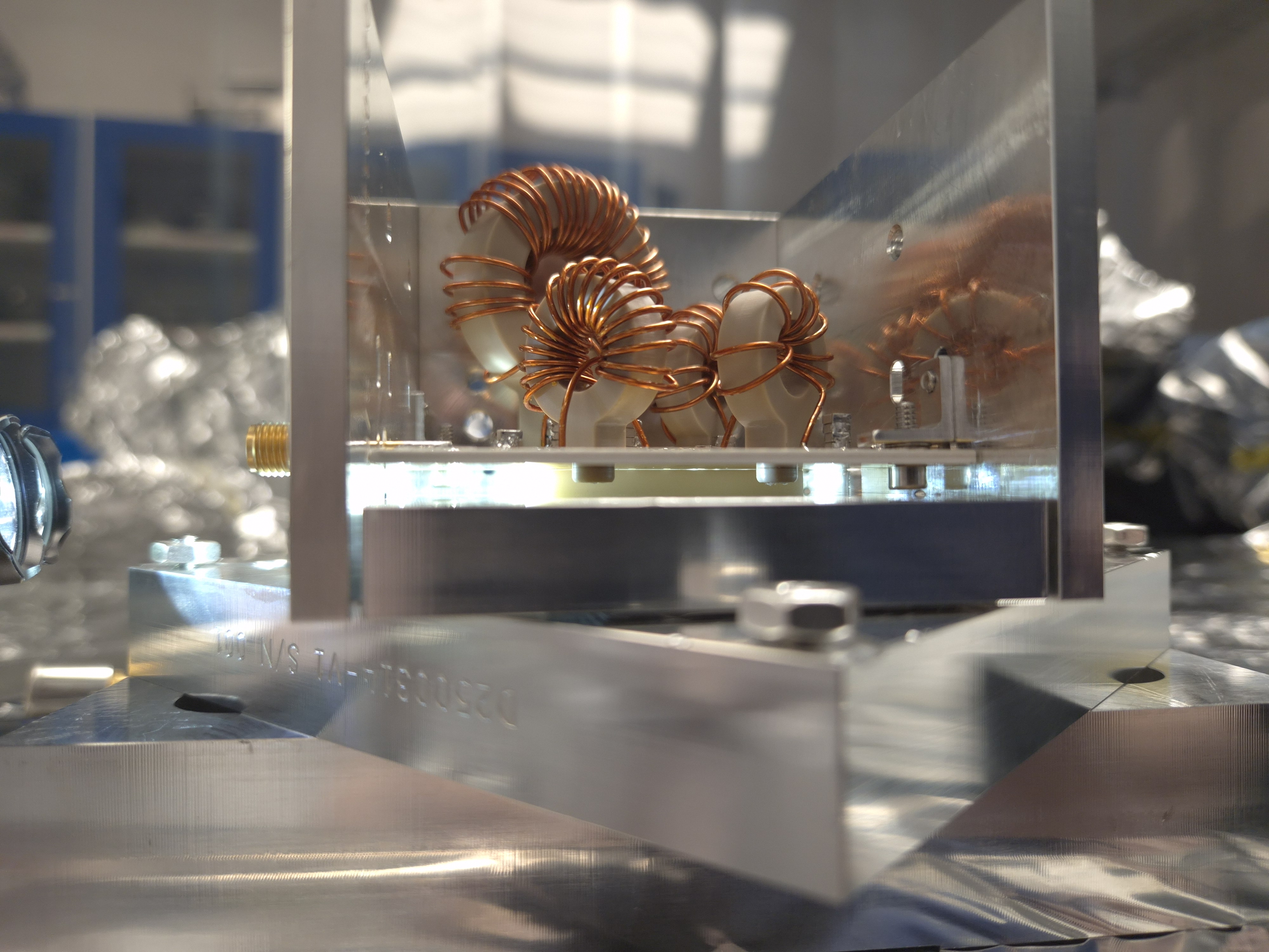 The problems are that we don't have any control over how much force is applied to the crystal. Moreover, in our "successful" trials, the board might not be touching the alumina piece along its entire length. Look at the picture, this is after the last (3rd) "successful" attempt with the alumina piece still in, the board and the face plate are not parallel with each other, we might be pinching the alumina thing at the corner closest to the output side. Not sure if it's always like this but it's likely.
