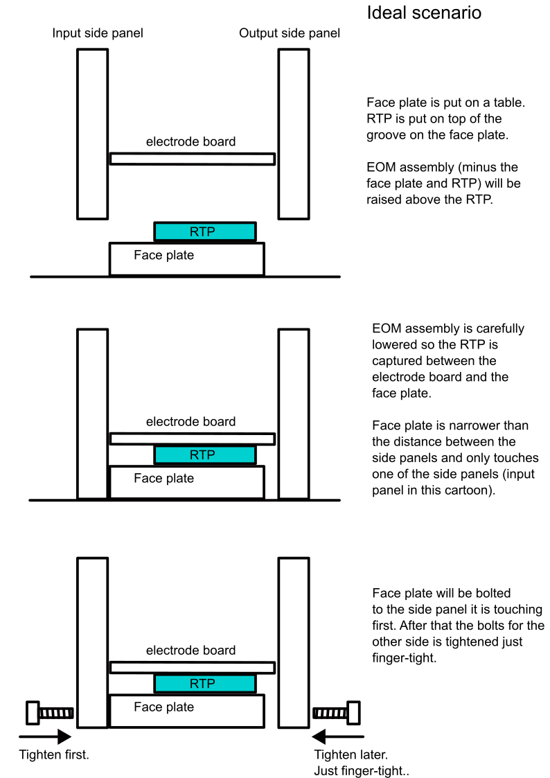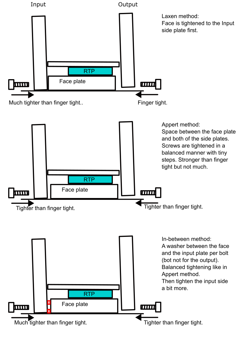 Stephen proposed an in-between method where we use washers between the input side plate and the front plate (bottom of three_methods.png cartoon). After the washer contacts the face plate AND the input side plate, screws are gently tightened in a balanced manner like in Appert method. (In a retrospect this is not that different from Laxen method except the way screws are tightened and that the input side plate contacts with the face plate at two points.)