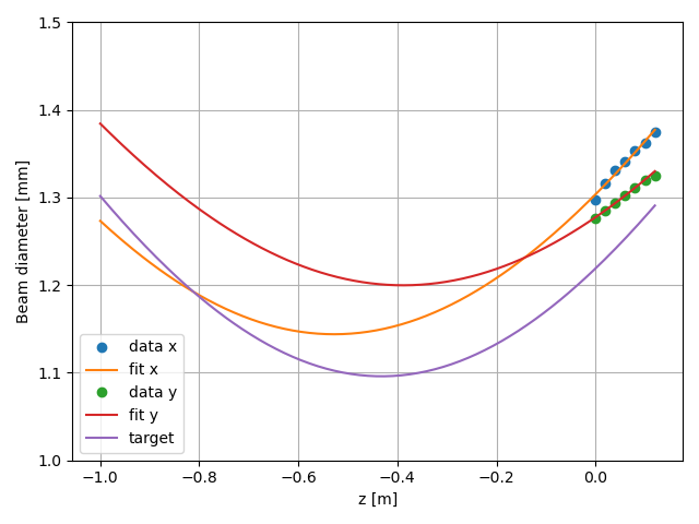Beam diameter is 1.4mm on the BL2. The diameter of lens aperture is 0.2" (~5mm).