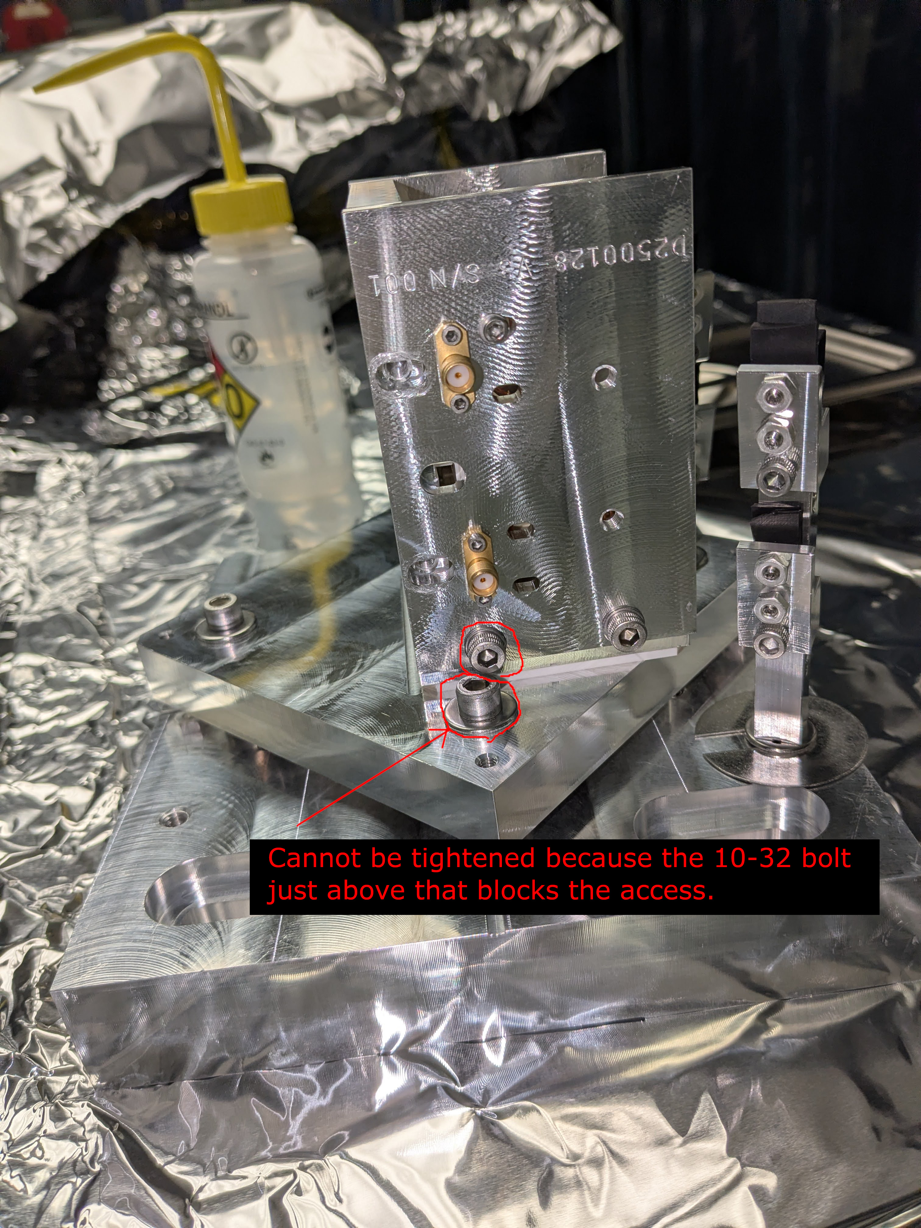 See the last picture. One 1/4-20 screw cannot be tightened because the 10-32 bolt head just above that blocks access. We might replace the offending bolt with 10-32x0.375" pan head screw AND use the ball head Allen key for 1/4-20, that might work.