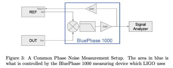 First Method: BluePhase1000_Setup.png (from LIGO-T2400324) Shows a simplified Phase noise measurements set up of what the BluePhase 1000 manual provides. A simple way to take phase noise measurements is to mix the signal from the Device under Test (DUT) with a reference device (REF) outputting the same frequency but at quadrature. Ideally, this mix outputs only the differential noise between the two devices. If the reference device has much better performance, then the mix ideally outputs only the DUT noise. In this method, a feedback loop is used to keep the REF at quadrature with the DUT. For the REF device, I used the 80MHz OCXO housed in LIGO-D1100663.