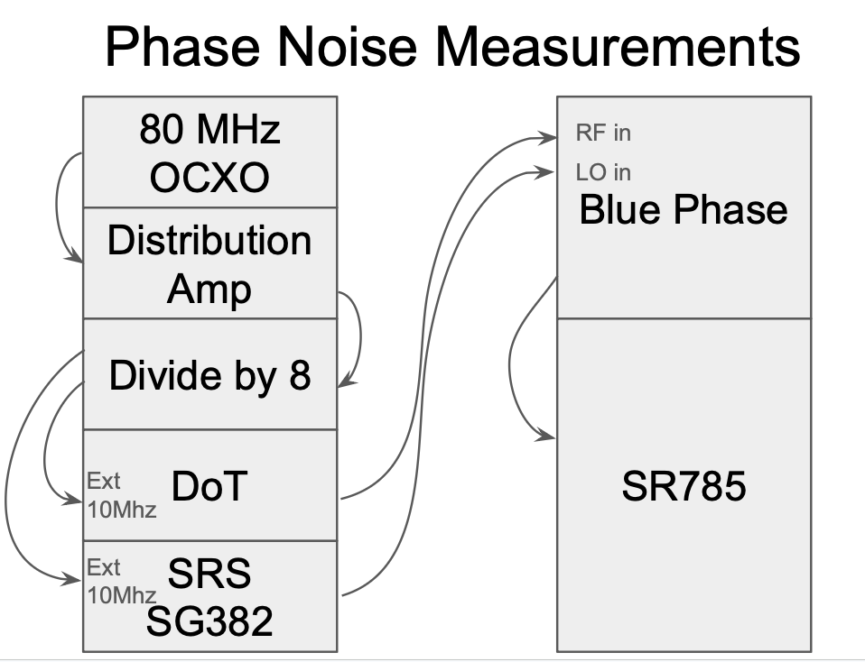 Second Method: PhaseNoiseSetUp.png shows the modified set up; where the REF device is the SRS SG382. This method puts the REF device at quadrature by setting it manually and holding it there through the 10MHz timing port created by dividing by 8 the 80MHz OCXO signal. Since both the REF and DUT are referenced to the same OCXO (or the DUT is the OCXO itself), ideally both devices will be held at quadrature bypassing the need for a feedback loop. In practice, I did notice a small amount of drift from quadrature over time.