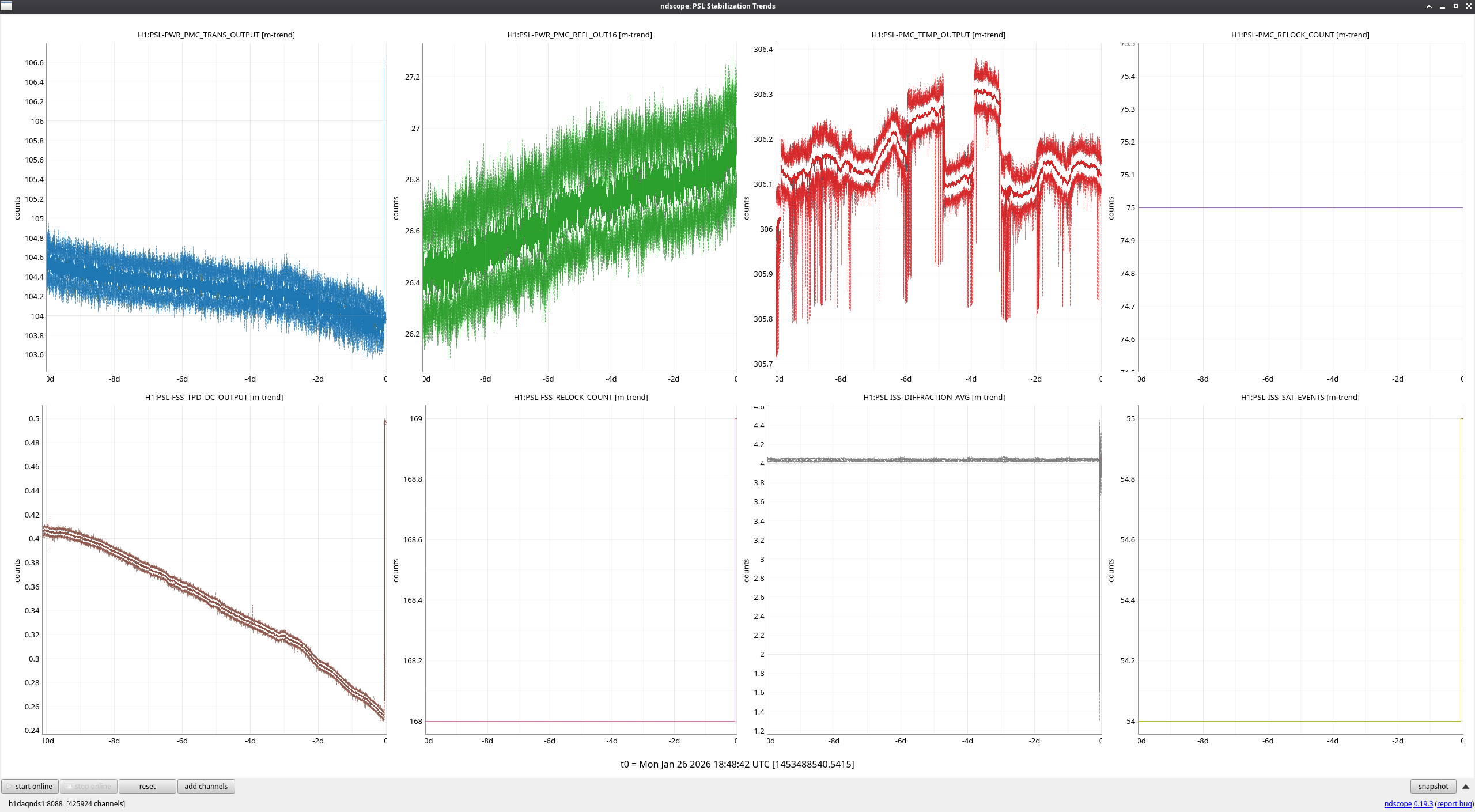 I touched up RefCav alignment this morning (alog88891) and turned on the ISS. PMC alignment may be drifting slightly, but I left that alone so as not to significantly change the output power and potentially disturb the JAC installation team. Not much else to report this week.