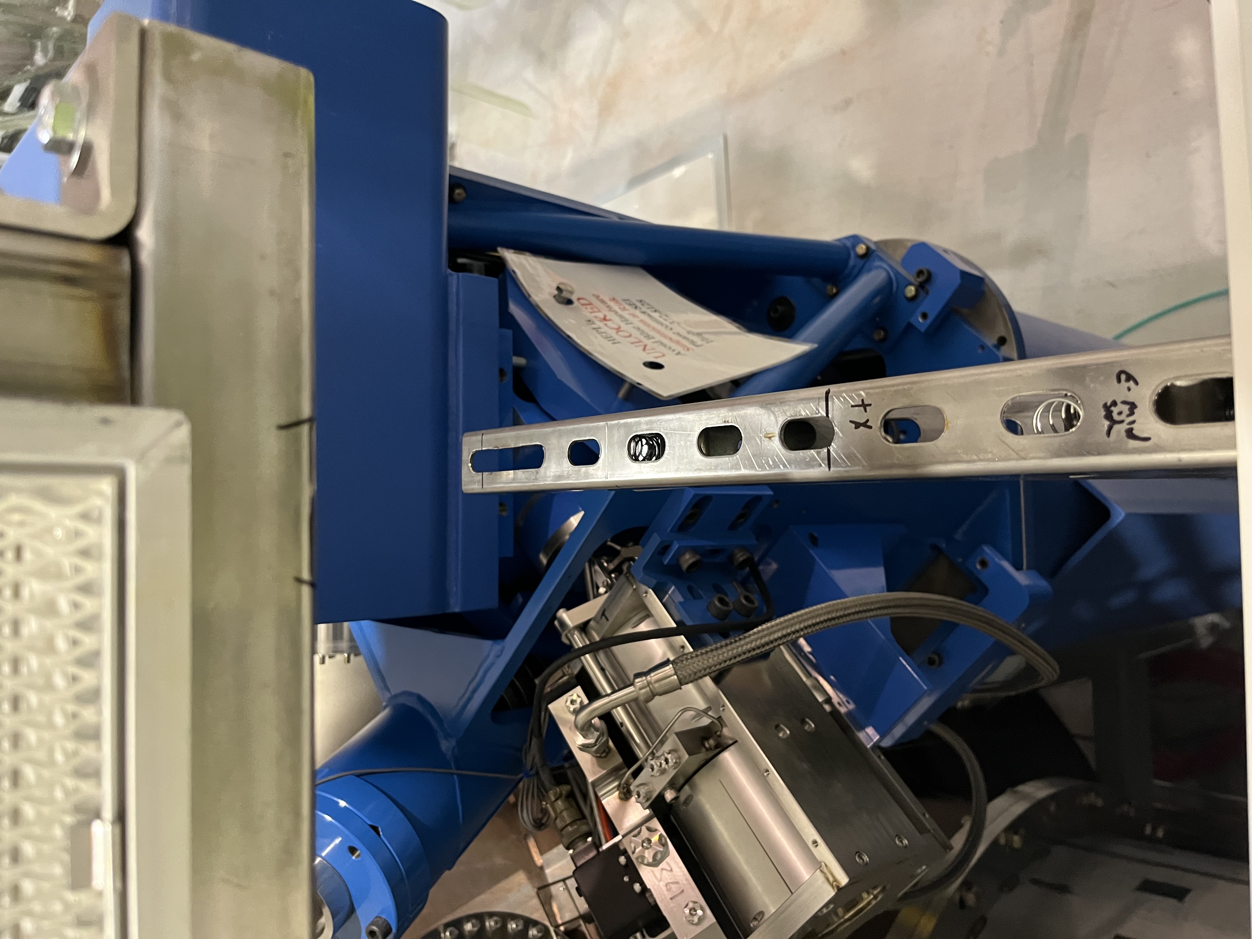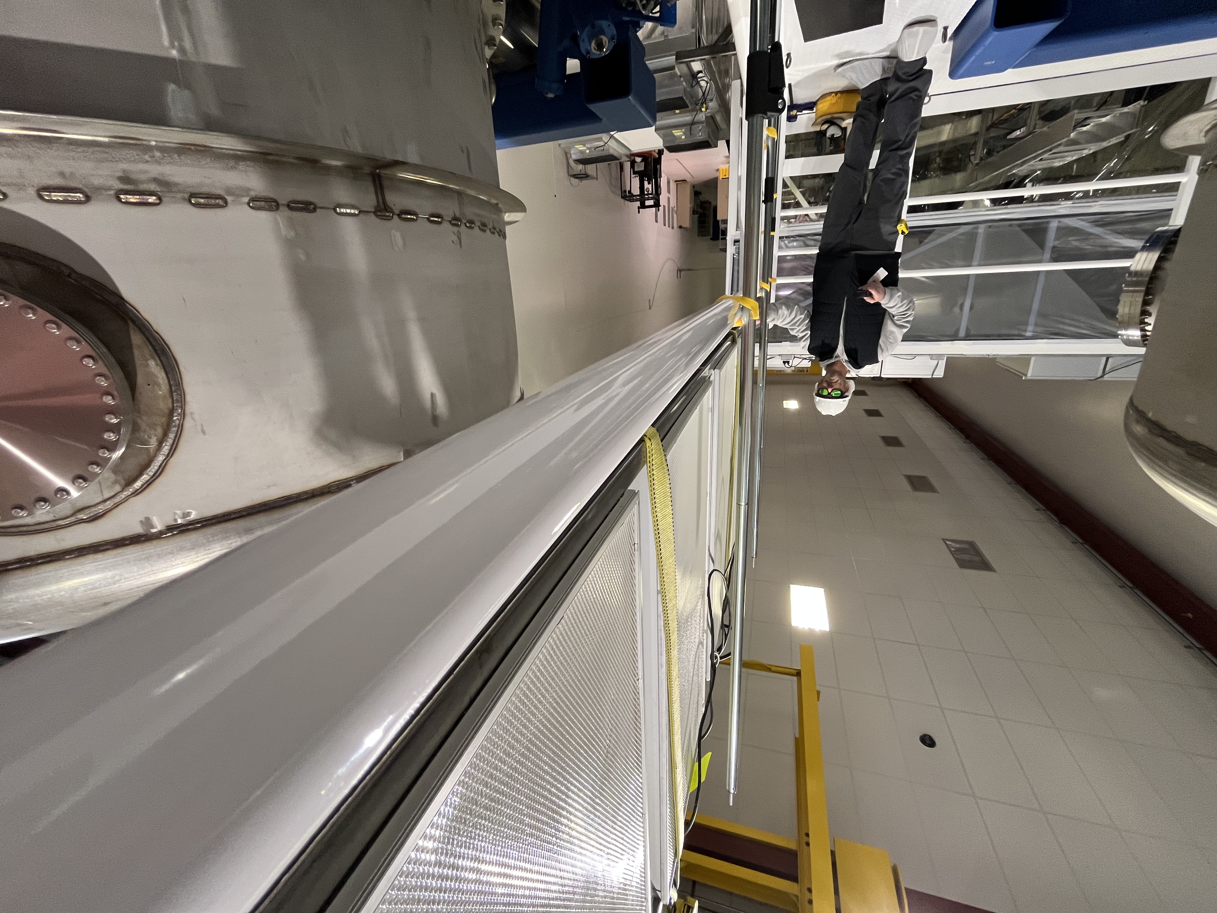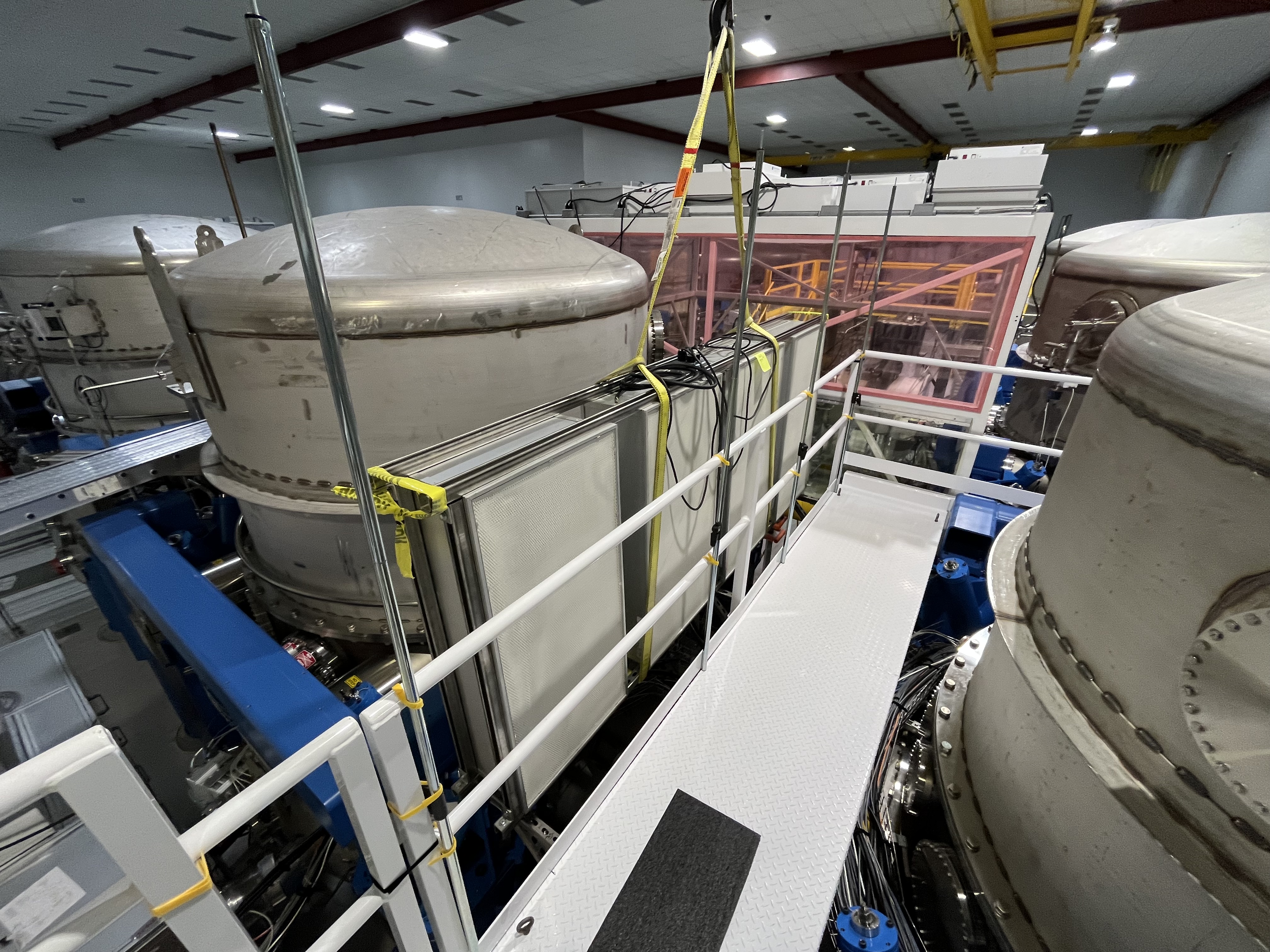 Randy designed a unistrut framework for this 4-HEPA fan Array (weighs 377lbs). This morning this assembly was carefully craned into place on top of 3 unistrut brackets attached to the BSC work platform (in between BSC1 & BSC2). For added support, this afternoon, Randy added a "leg support" on both ends of this HEPA Filter Fan Array (here is a photo of one of these legs that is in the Beer Garden).