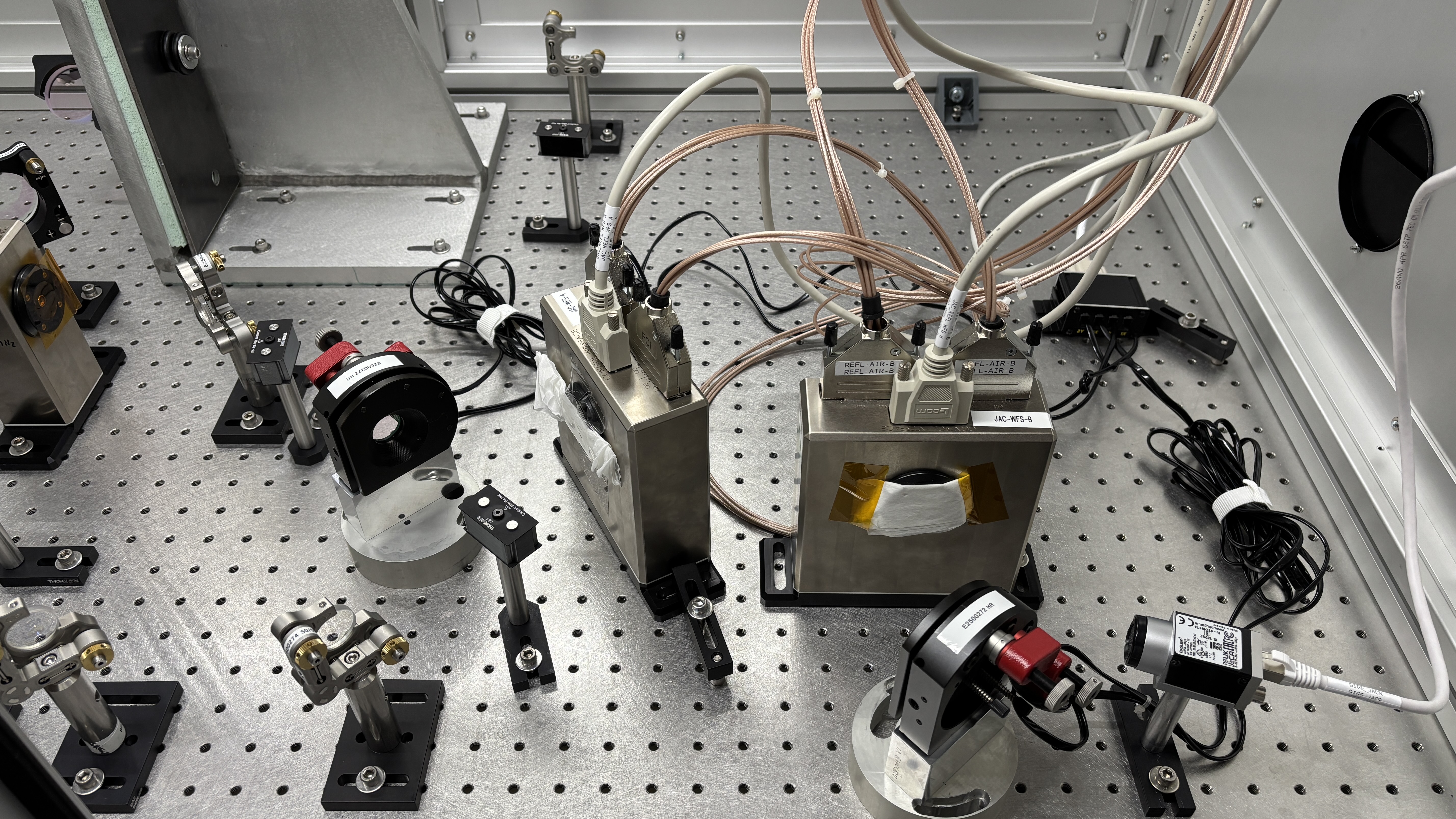 The new IOT1 in-air optics table, a.k.a. the "JAC table," now has all of its optics, wavefront sensors, and photodiodes mounted, cables run, and is ready to be rolled up chamberside. This table is slated to be on the -Y side of HAM1 and contain PDs and WFS for the JAC reflected beam path.