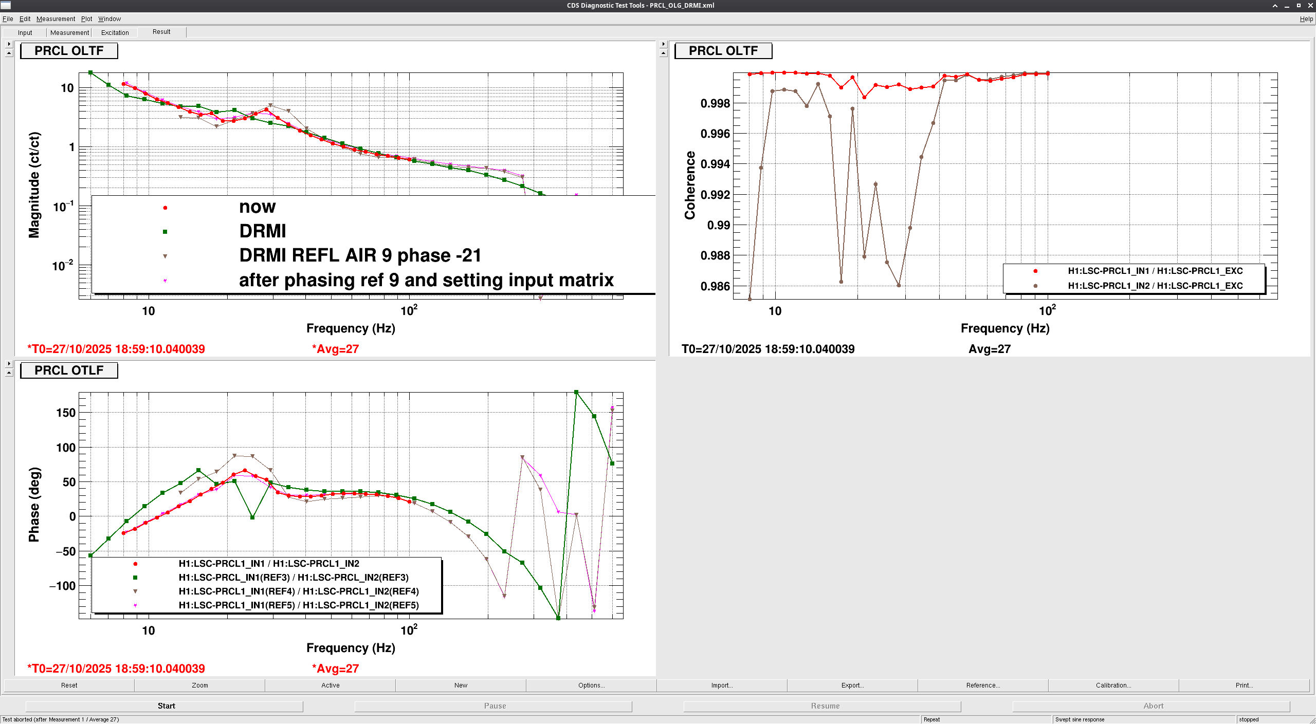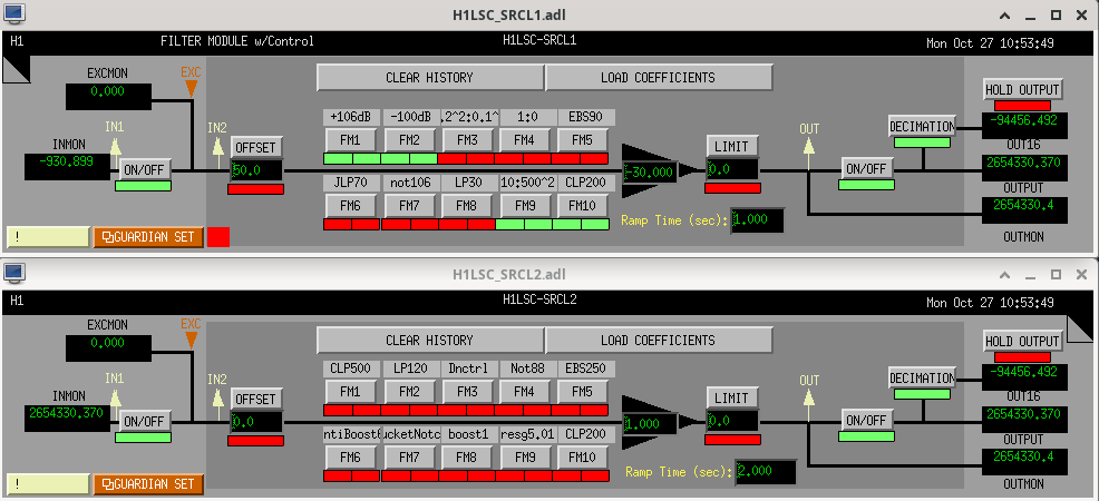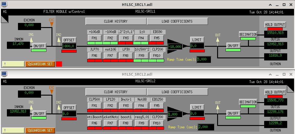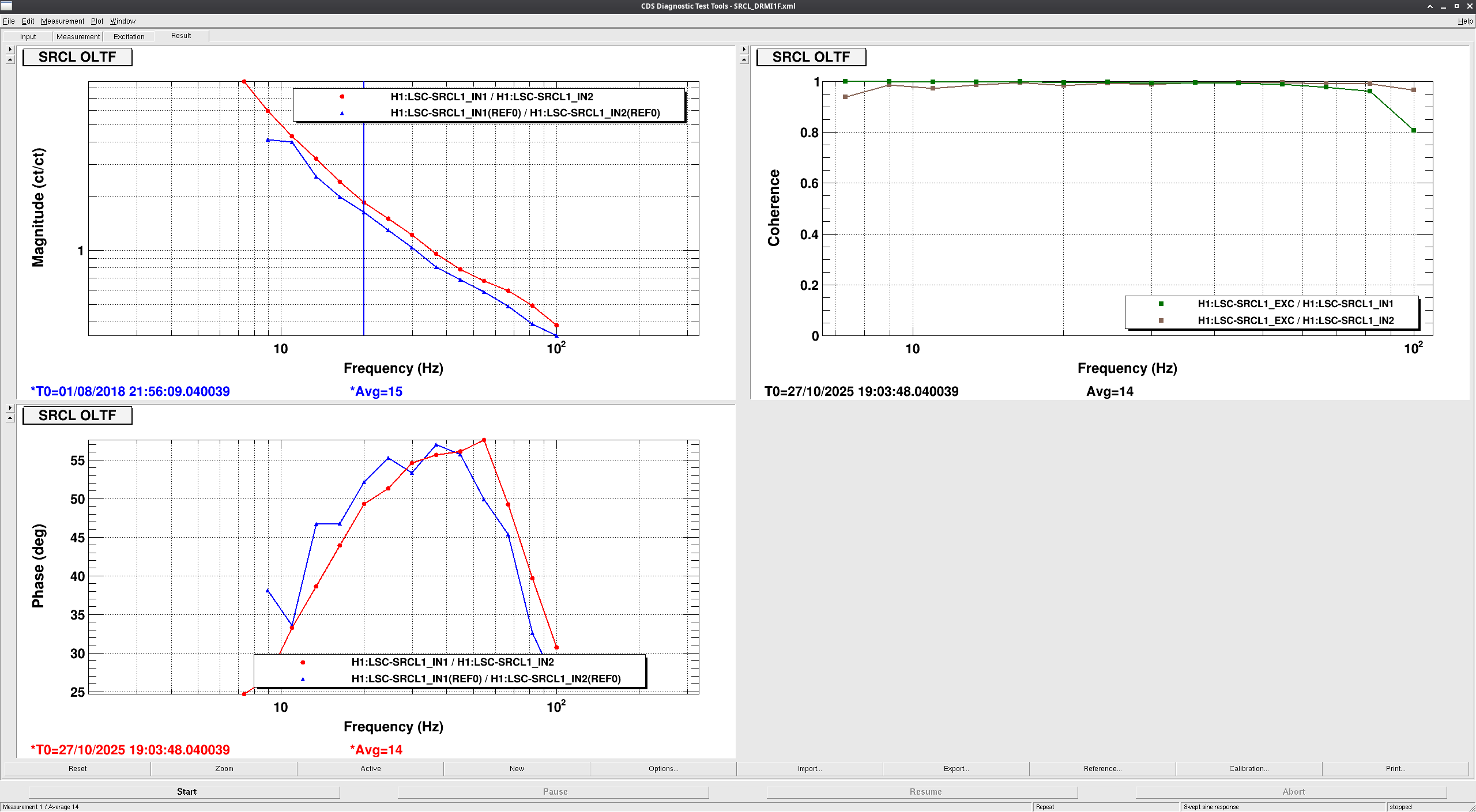 I don't have a sense of what exactly the problem is yet, but last week's adventure taught us that this 1 Hz instability is related to the gain of SRCL just as much as it is related to the DHARD, CHARD and CSOFT gains. I checked the SRCL UGF today when we reached NLN and it was at 10.5 Hz, which seems low even by these standards.