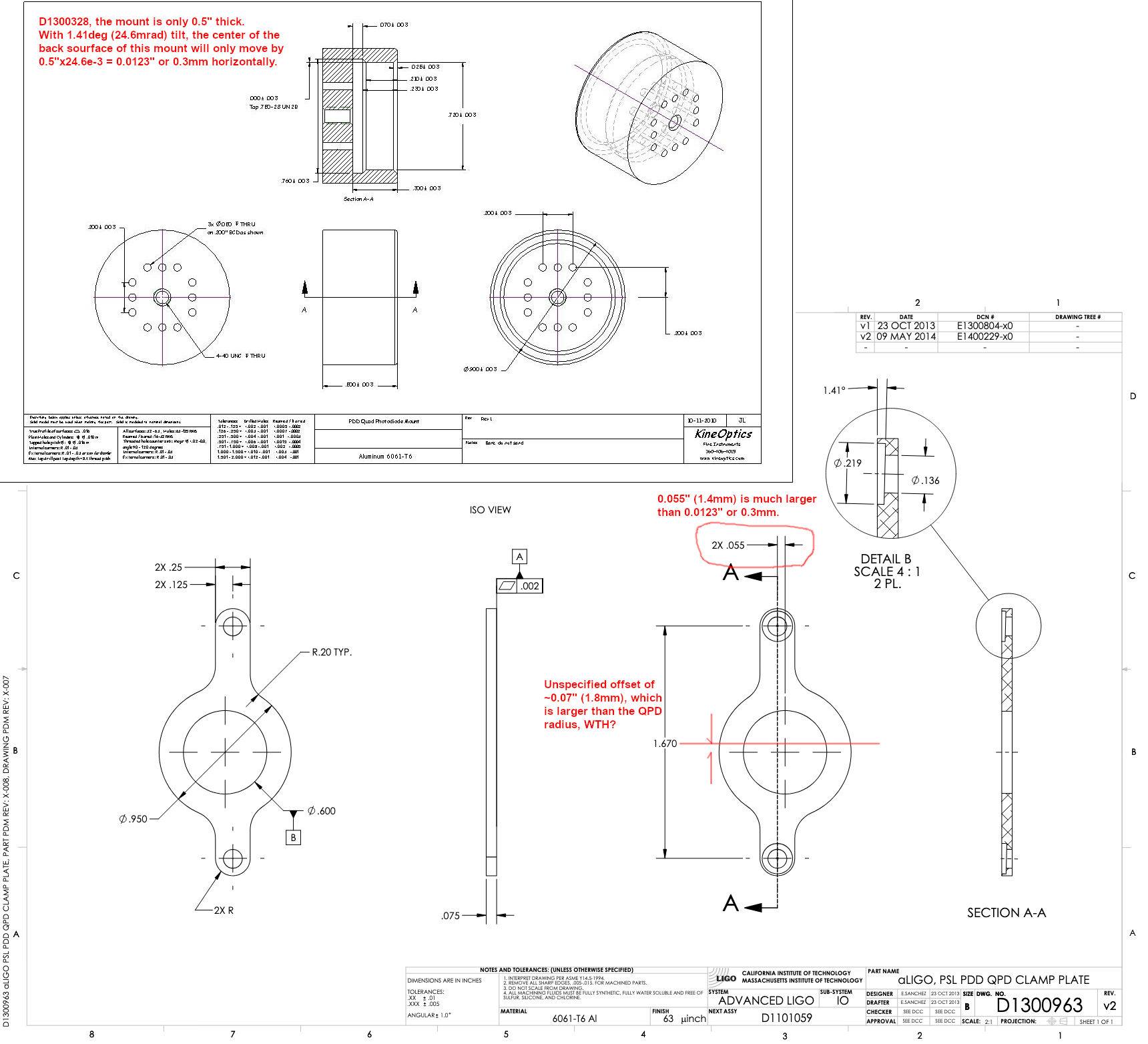 In the 4th attachment, you can see that the "center" hole of the QPD clamp is offset by 0.55" (1.4mm) in the direction orthogonal to A-A, and about 0.07" (even though this number is not specified anywhere in the drawing) or 1.8mm in A-A direction. So the total lateral offset is sqrt(1.4^2+1.8^2)~2.3mm. OTOH, the QPD assy is only 0.5" thick, so the lateral shift arising from the 1.41deg tilt at the back of the QPD assy is just 1.41/180*pi*0.5=0.0123" or 0.3mm.