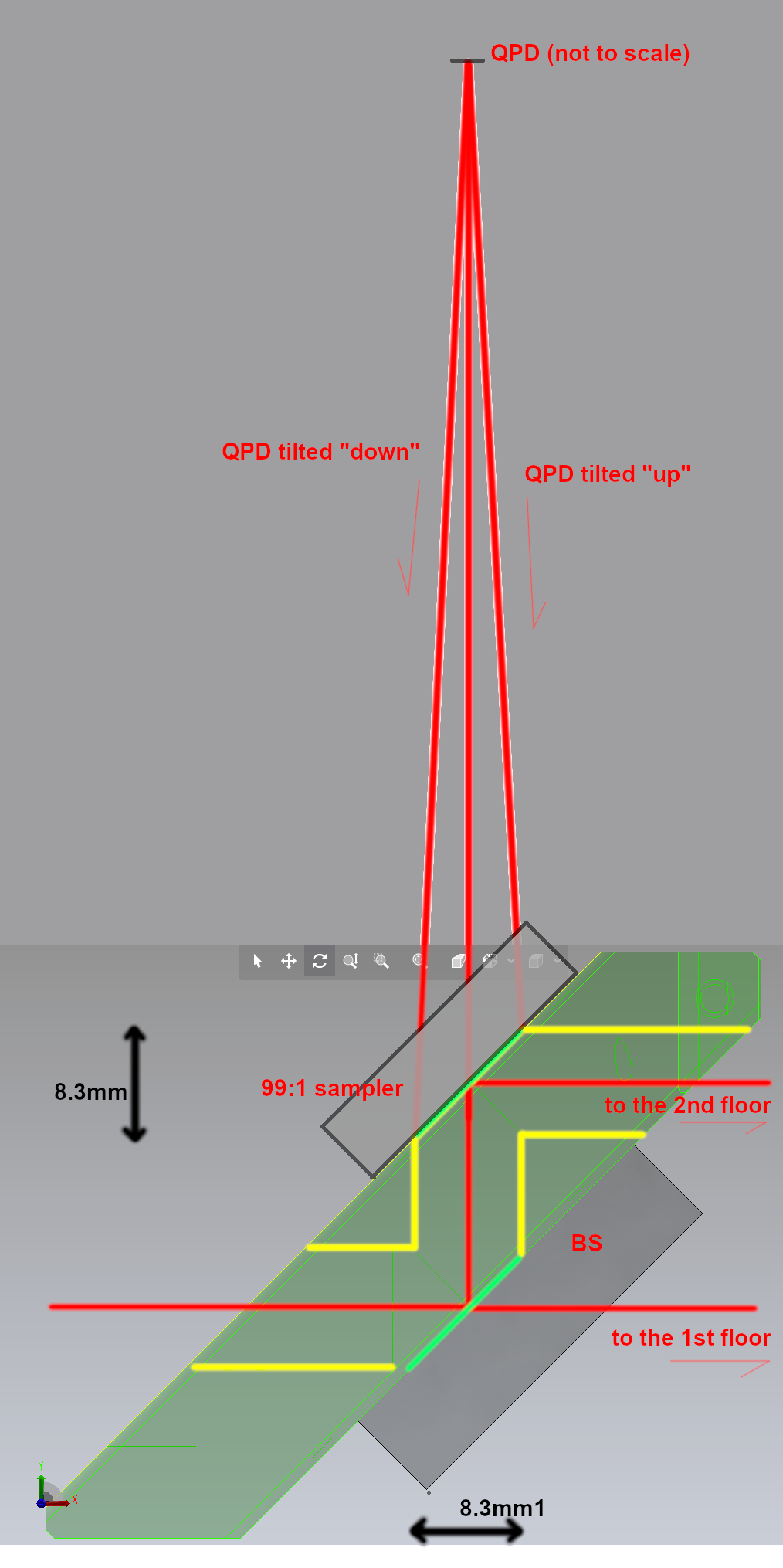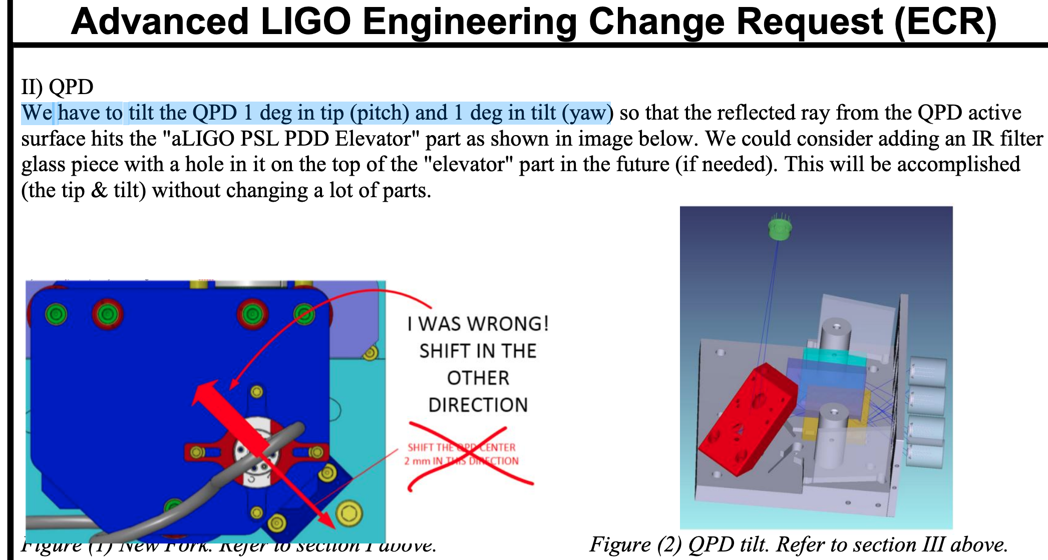 However, I suspect that "pitch" and "yaw" in the above sentence might have been misused. In the right figure of the 6th attachment (screeshot of ECR unedited), it seems that the QPD reflection hits the elevator (the red 45 degree thing in the figure) at around 6 O'clock position around the eliptic exit hole, which means that the QPD is tilted in its optical PIT. If it's really tilted 1 degree in optical PIT and 1 degree in optical YAW, the reflection will hit something like 7:30 position instead of 6:00.