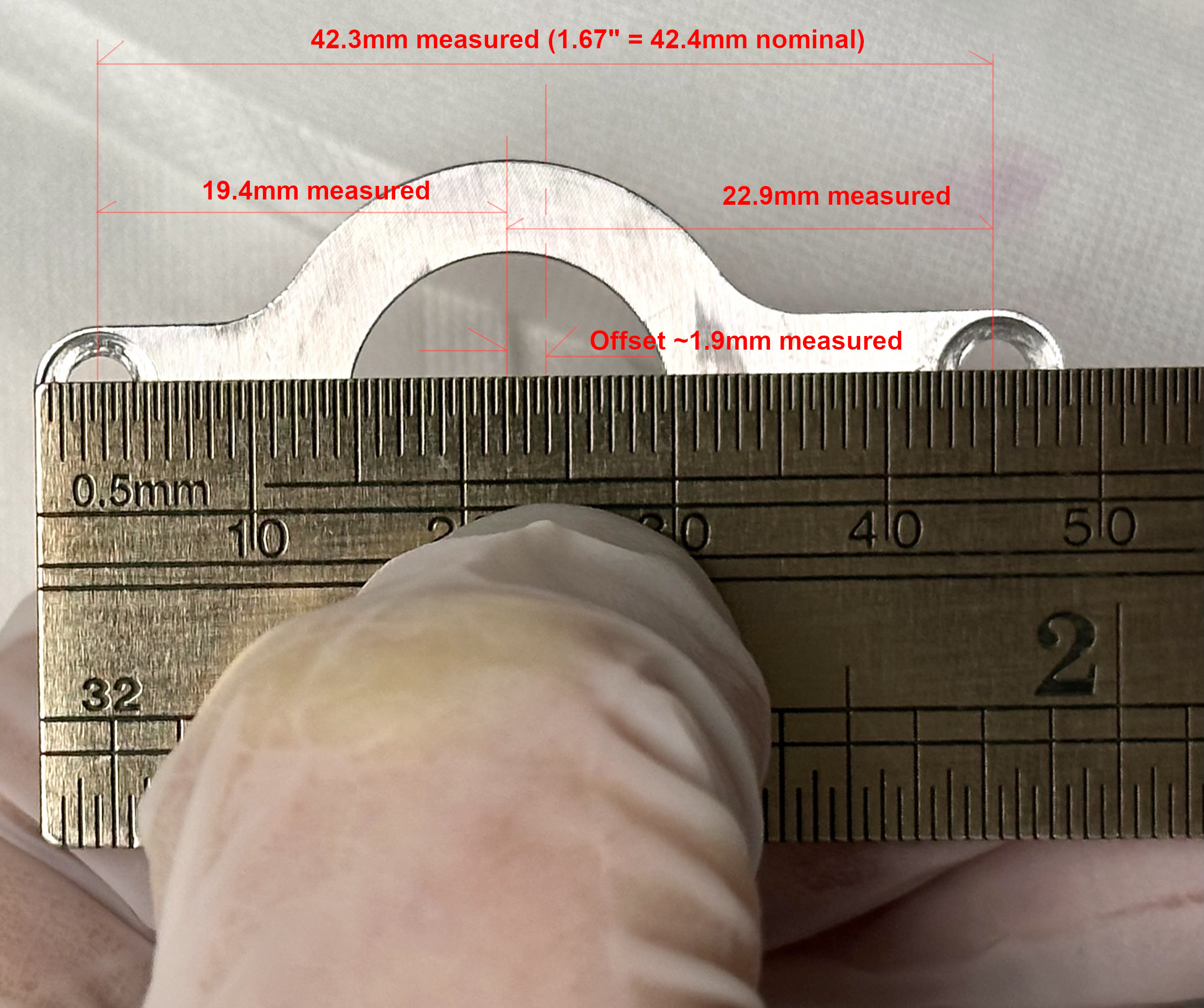 The offset of the center bore along the line connecting the two screw holes was measured to be about 1.9mm, which agrees pretty well with the above alog where I wrote "(even though this number is not specified anywhere in the drawing) or 1.8mm".