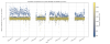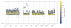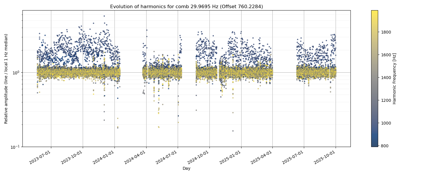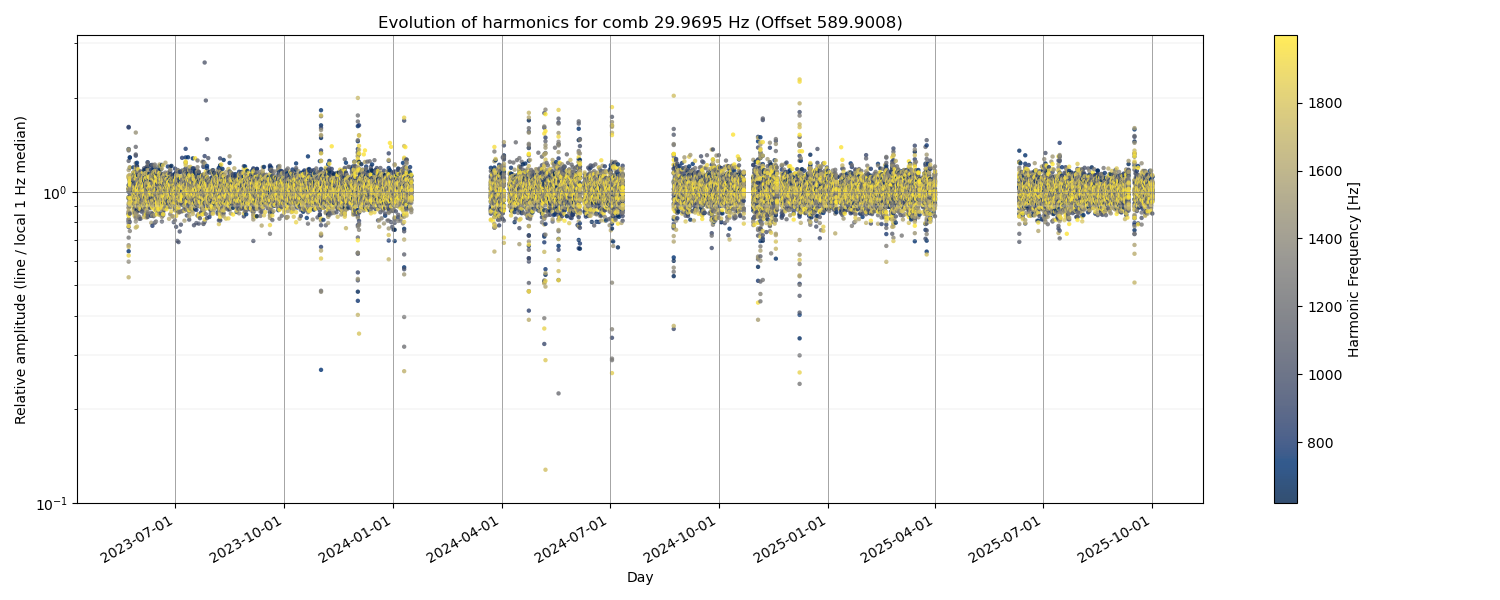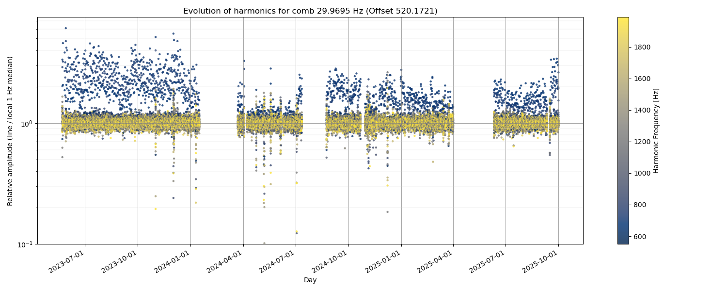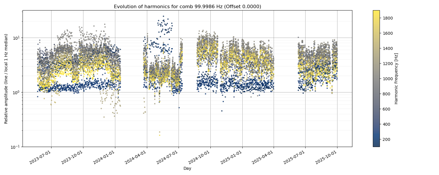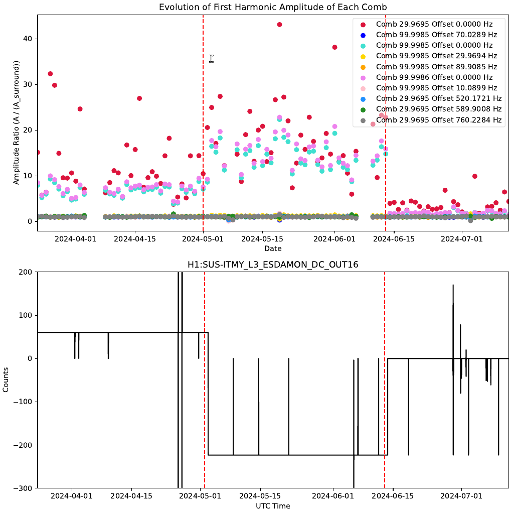 After determining in which channels the peaks appear present, we have studied the coincidence of changes in the comb heights versus the bias in the H1:SUS-ITMY_L3_ESDAMON_DC_OUT16. The following figure shows the coincidences between the changes in the relative amplitude of the first harmonic of each comb (sort of SNR) in DARM and the mean counts in H1:SUS-ITMY_L3_ESDAMON_DC_OUT16 across time. It can be seen that previously to May 2nd, the channel count was set to 60. Once it changed to around -223 after that date, the SNR of the peaks overall increased in a sudden way. Afterwards in June 13th when the count was reduced to 0, most peaks got a much lower SNR at the same time.