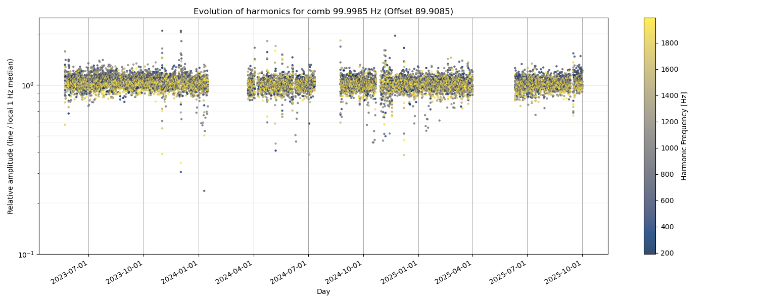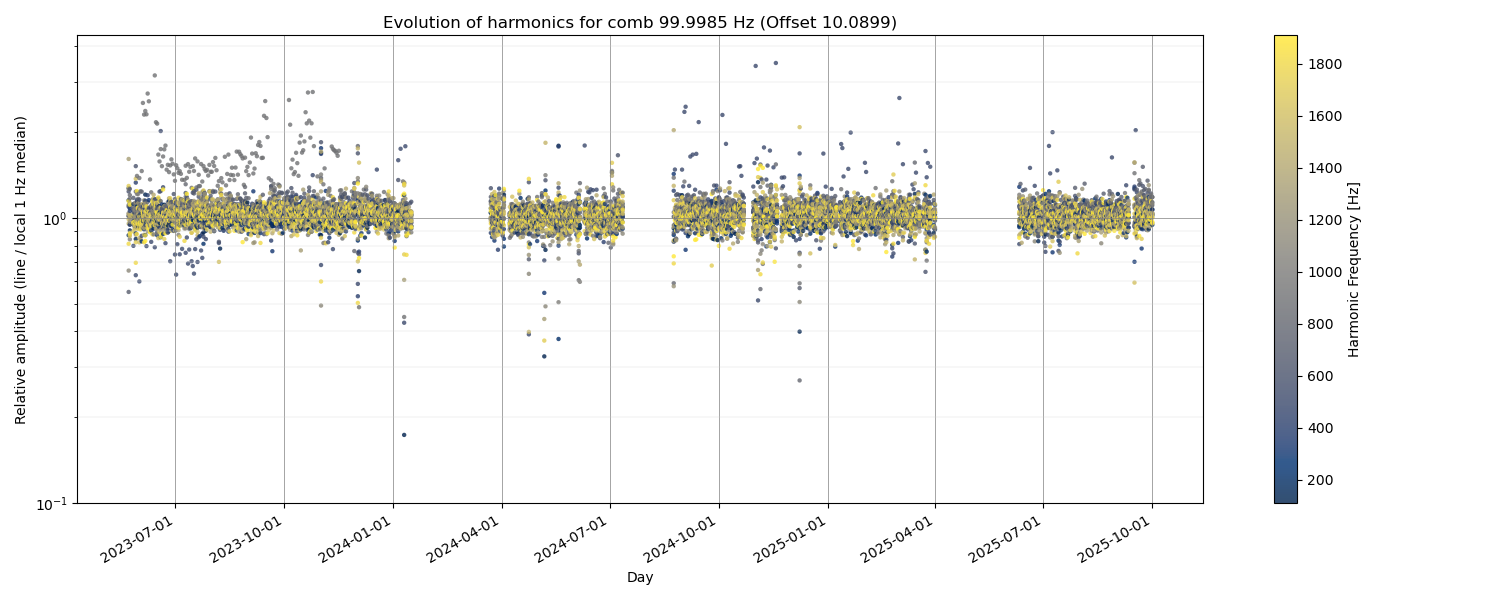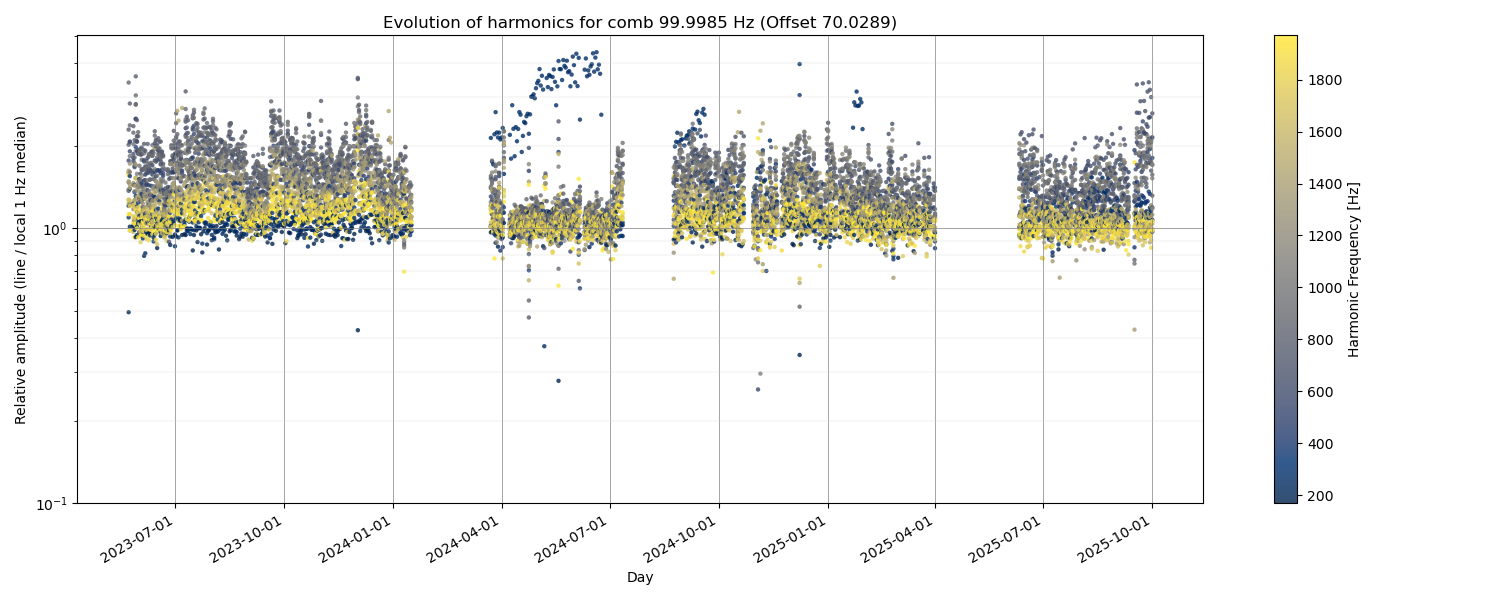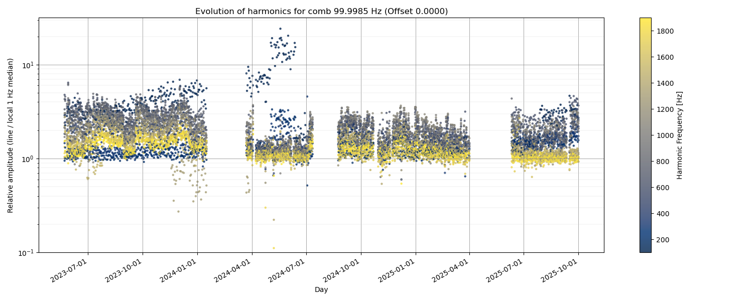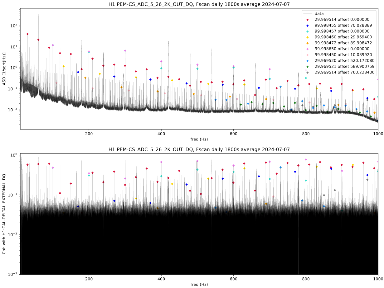 Looking at the 52 additional channels listed in LHO ADC channels list, we have found the following information: The combs appear in the following channels with high peaks and high coherence: - H1:PEM-CS_ADC_5_18_2K_OUT_DQ - H1:PEM-CS_ADC_5_21_2K_OUT_DQ - H1:PEM-CS_ADC_5_26_2K_OUT_DQ ! All combs appear here and with high peaks Some combs appear in the following channels with low peaks and low coherence: - H1:PEM-CS_ADC_5_22_2K_OUT_DQ - H1:PEM-CS_ADC_5_23_2K_OUT_DQ - H1:PEM-CS_ADC_5_24_2K_OUT_DQ The following channels do not show the peaks but show an increase in coherence from July 1st to July 7th 2024: - H1:PEM-CS_ADC_5_25_2K_OUT_DQ - H1:PEM-CS_ADC_5_27_2K_OUT_DQ - H1:PEM-CS_ADC_5_30_2K_OUT_DQ Only the 99.99 Hz offset 0 combs appear in the following channels: - H1:PEM-CS_ADC_4_27_2K_OUT_DQ - H1:PEM-CS_ADC_4_28_2K_OUT_DQ - H1:PEM-CS_ADC_5_19_2K_OUT_DQ - H1:PEM-CS_ADC_5_20_2K_OUT_DQ - H1:PEM-CS_ADC_5_31_2K_OUT_DQ In the arms, the following channels show coherence with only the 99.99 Hz offset 0 combs: - H1:PEM-EX_ADC_0_09_OUT_DQ - H1:PEM-EX_ADC_0_13_OUT_DQ - H1:PEM-EY_ADC_0_11_OUT_DQ - H1:PEM-EY_ADC_0_12_OUT_DQ - H1:PEM-EY_ADC_0_13_OUT_DQ - H1:PEM-EY_ADC_0_14_OUT_DQ The following channels show the unexpected behavior of showing the 99.99 Hz peak in July 1st with coherence, but it disappears on July 7th: - H1:PEM-EX_ADC_0_12_OUT_DQ In summary, after investigating the Fscan channel list and the additional channels. The ones that seem more promising as showing most of the lines with high coherence and high amplitude peaks are: - H1:PEM-CS_ADC_5_18_2K_OUT_DQ - H1:PEM-CS_ADC_5_21_2K_OUT_DQ - H1:PEM-CS_ADC_5_26_2K_OUT_DQ - H1:IMC-F_OUT_DQ - H1:LSC-MCL_IN1_DQ - H1:LSC-MICH_IN1_DQ - H1:PEM-CS_MAG_EBAY_LSCRACK_X_DQ - H1:PEM-CS_MAG_EBAY_LSCRACK_Y_DQ - H1:PEM-CS_MAG_EBAY_LSCRACK_Z_DQ - H1:PEM-CS_MAG_LVEA_INPUTOPTICS_X_DQ - H1:PEM-CS_MAG_LVEA_INPUTOPTICS_Y_DQ - H1:PEM-CS_MAG_LVEA_INPUTOPTICS_Z_DQ - H1:PEM-CS_MAG_EBAY_SUSRACK_X_DQ - H1:PEM-CS_MAG_LVEA_OUTPUTOPTICS_X_DQ Of these, channel H1:PEM-CS_ADC_5_26_2K_OUT_DQ appears to be the one with the highest amplitudes. The following figure illustrates its ASD and Coherence with DARM on the date of July 7, 2024, showing the peaks for the harmonics of the combs in this study. As can be seen in the ASD, the highest peaks are those in the list of the near-30 and near-100 Hz plots. The only peaks higher than these are the power mains at powers of 60 Hz. This channel shows all the combs listed. Most of these combs also show very high coherence with DARM.![]()