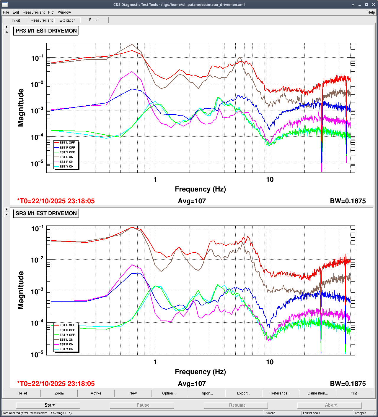 We managed to track down the source of the 0.6 Hz oscillation that we see at move spots and full power. It seems to be the result of the new pitch and length estimators on PR3 and SR3 that were installed on Tuesday. We tested this by sitting at move spots (after the spots converged), and turning on and off the estimators for a few minutes at a time. When turning ON the estimators, the 0.6 Hz ringing is not immediately apparent- it will slowly grow. However, once the 0.6 Hz oscillation is visible in the controls, turning OFF the estimator immediately stops the ringing. Therefore, we think this is the culprit for this instability. Oli will be turning off the length and pitch estimators for PR3 and SR3 for now. The yaw estimators are still on because they have been operating stably for a long time and were not changed this Tuesday.