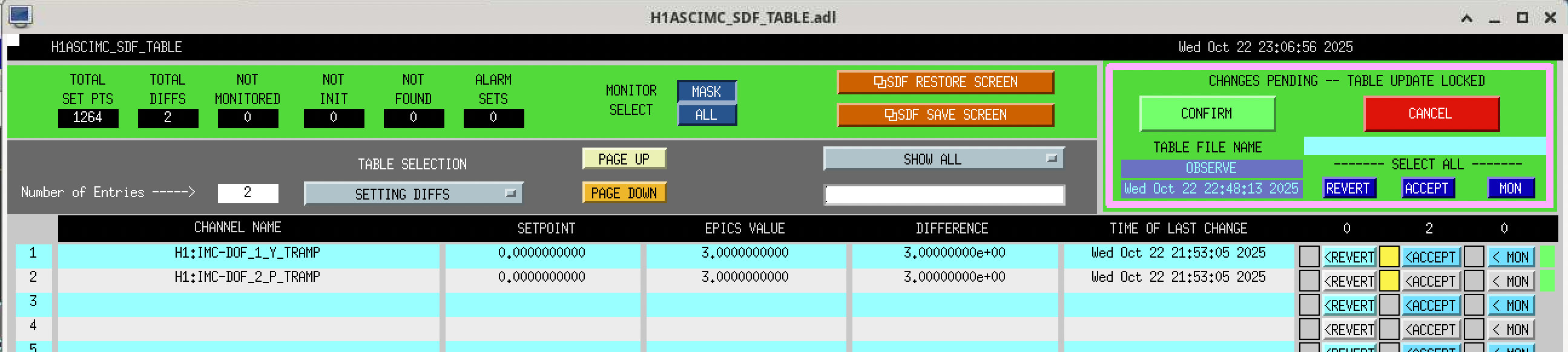 Got called at 10:57PM (PT) and IFO was actually locked in NLN with one SDF Diff, which I accepted and is screenshot is below (IMC_DOF_1_P TRAMP from 0 to 3 and IMC_DOF_2_Y TRAMP from 0 to 3).