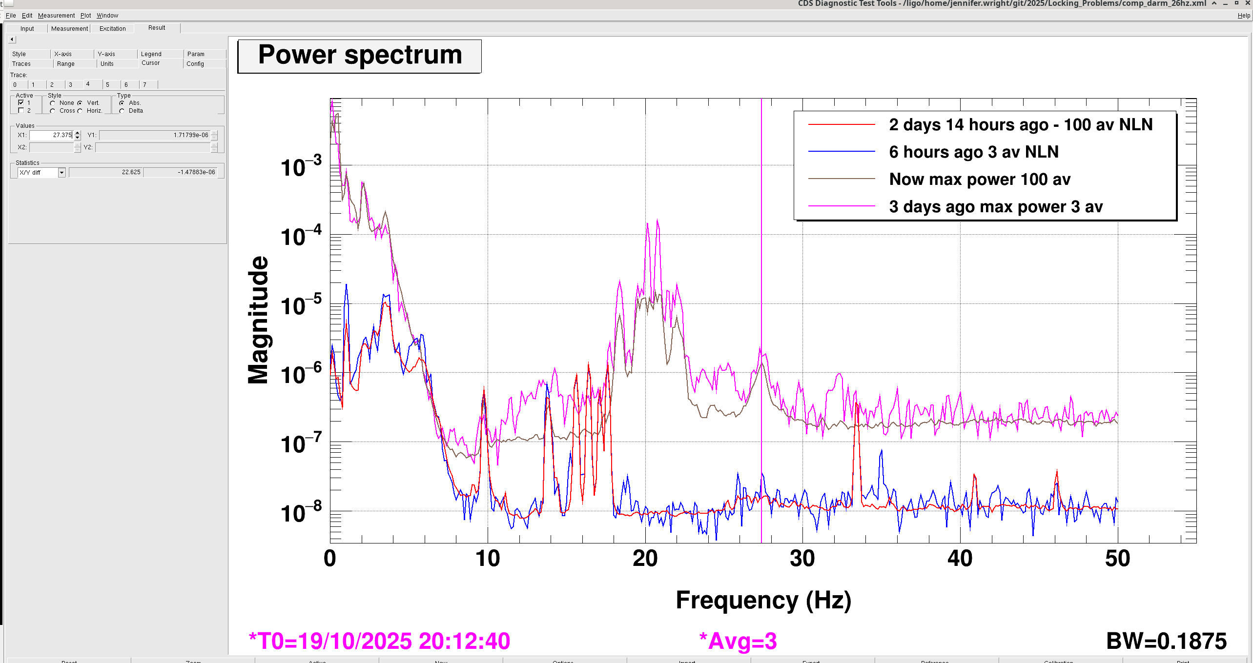 Jenne asked me to check a line around 27 Hz, this does show up in max power (today see brown trace) but also was there in max power before maintenance Tuesday this week (pink trace).