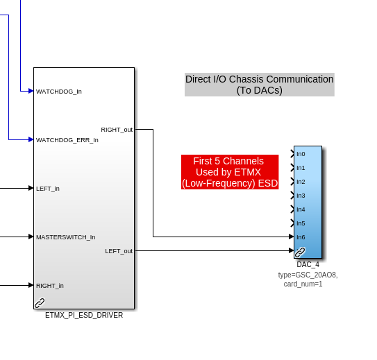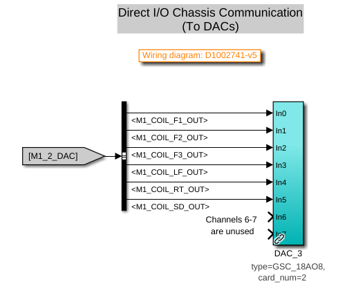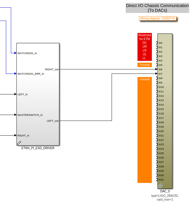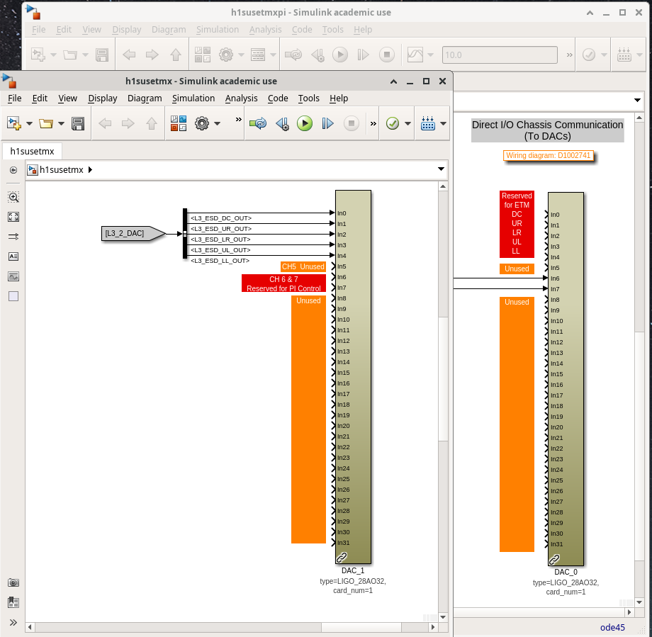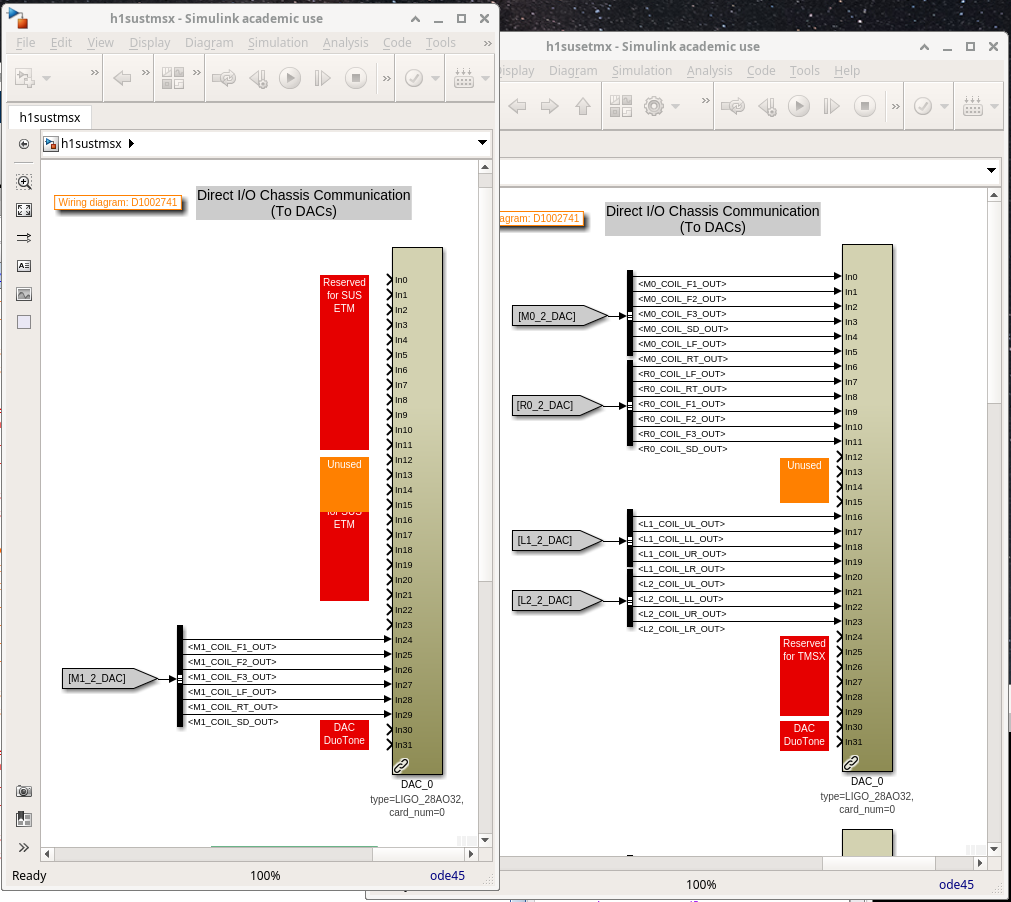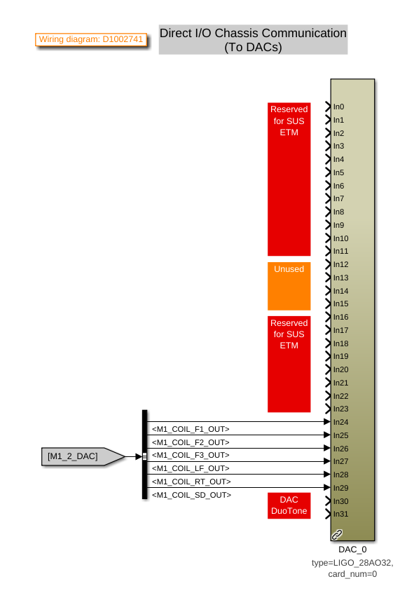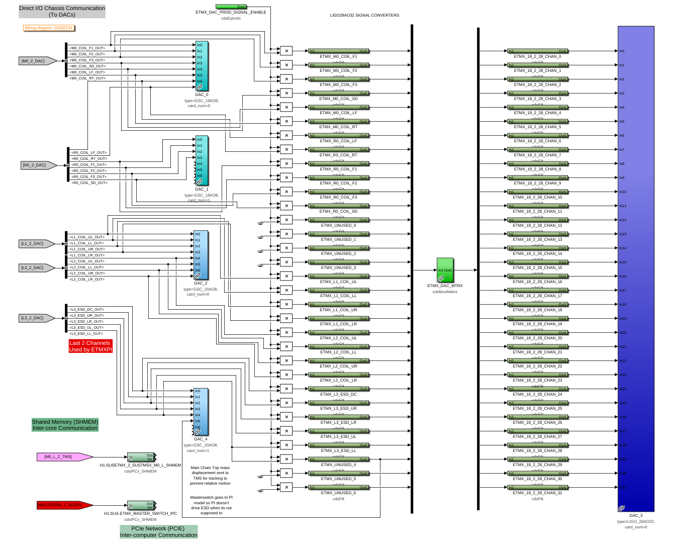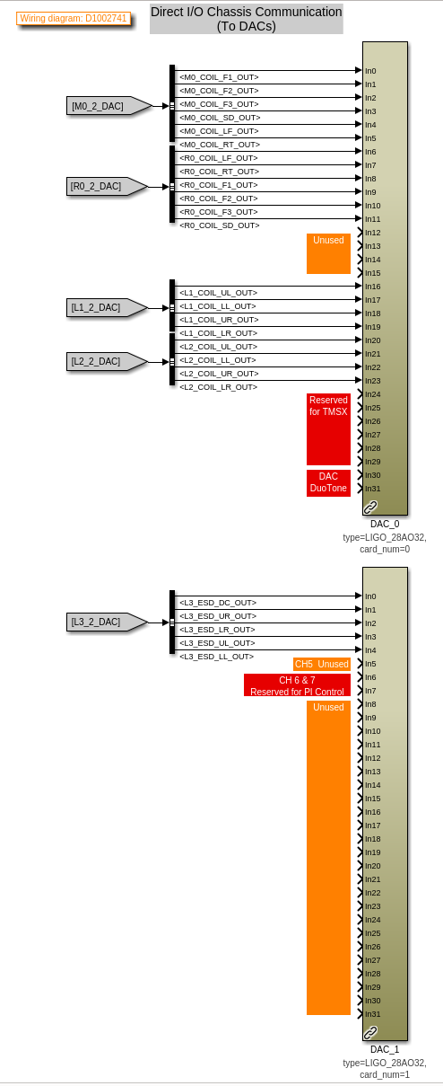 J. Kissel ECRs: E2400409 and E2500296 IIET: 35739 and 35706, respectively WP: 12901 DWG: D1002741 This morning, I updated the front-end user models for the X end station -- h1susetmx, h1susetmxpi, and h1sustmsx -- leveraging all the work and gotchas from yesterday's 32CH DAC upgrade of the Y-end station front end models (Primary models LHO:88280, Inconsequentially Updating Libraries LHO:88283, and Adding DAC compensation filters to the ETM PI library part LHO:88285). The good thing about having the end-stations use identical wiring diagrams means that I can literally copy and paste the digital representations of the DAC connections and cards. I've confirmed that the library part change to the ETM PI library correctly updated in the h1susetmxpi model without effort. The only "difference" was that the top level of the ETMX QUAD model, h1susetmx, had all of the messy prototyping pick-off infrastructure for the early 32CH DAC testing which can now all be ripped out and made to look clean and simple like ETMY's. I attach before vs. after screenshots for posterity. The revisions of the models that have been successfully compiled: /opt/rtcds/userapps/release/sus/h1/models/ h1susetmx.mdl r28431 --> r34046 BEFORE vs AFTER sus/common/models/ESD_LINEARIZATION_WITH_CHARGE_MASTER.mdl : r16336 --> r30316 h1susetmxpi.mdl r27215 --> r34048 BEFORE vs AFTER sus/common/models/PI_MASTER_V2.mdl : r26600 --> r34033 h1sustmsx.mdl r27182 --> r34050 BEFORE vs AFTER And as before, I also attach a screenshot of the usage of DAC0 and DAC1 across front-end models. Today I decided to be a little more color-coded with my notes on channel usage; red for consumed/reserved in other models, orange for actually physically unused.