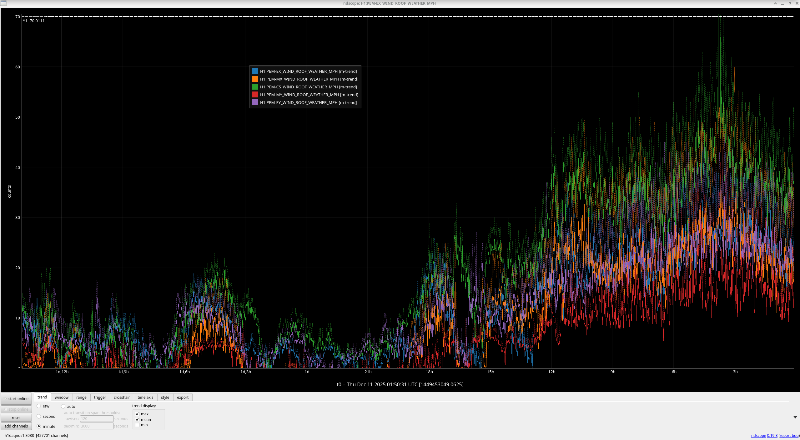 J. Kissel Post Dec 4th power outage, we've have an EPIC week of windstorms that have inhibited recovery effort, which has delayed upgrade progress. The summary pages (on their 24 hour cadence) and the OPS logs / environment summary don't really convey this well, so here's a citable link to show how bad last Friday (12/05), Monday (12/08), and Wednesday (12/10) were in terms of wind. Given the normal work weekend, it means that we really haven't had a conducive environment to recover from even a normal lockloss, let alone a 2-hour site-wide power outage. The attached screenshot is of the MAX minute trends (NOT the MEAN, to convey how bad it was) of wind speed at each station in UTC time. The 16:00 UTC hour mark is 08:00 PST -- the rough start of the human work day, so the vertical grid is marking the work days. The arrow (and period where there's red-dashed 0 MPH no data) shows the 12/04 power outage. The horizontal bar shows the weekend when we humans were trying to recover ourselves and not the IFO.