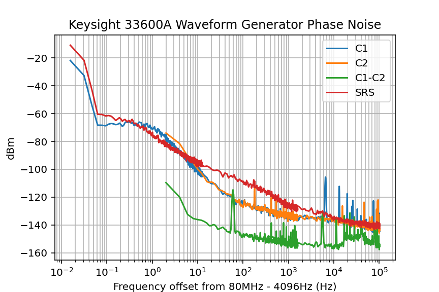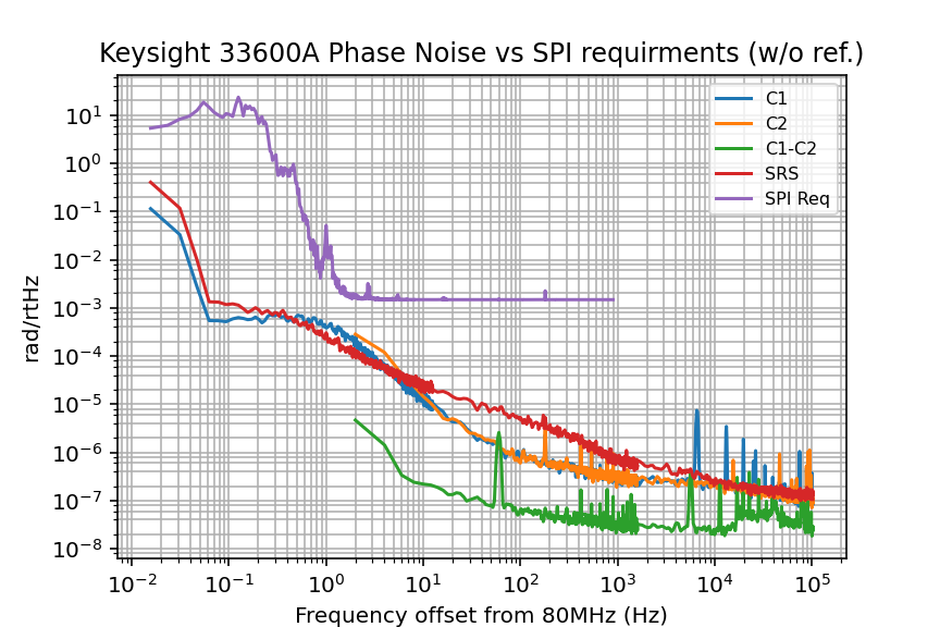 I took Phase noise measurements of the 2 channel Keysight 33600A waveform generator for its use in building SPI Pathfinder in the optics lab before install. Going only off of the phase noise graphs, it is sufficient as it shows comparable results to the SRS which had a phase noise considered to be good enough for SPI pathfinder.