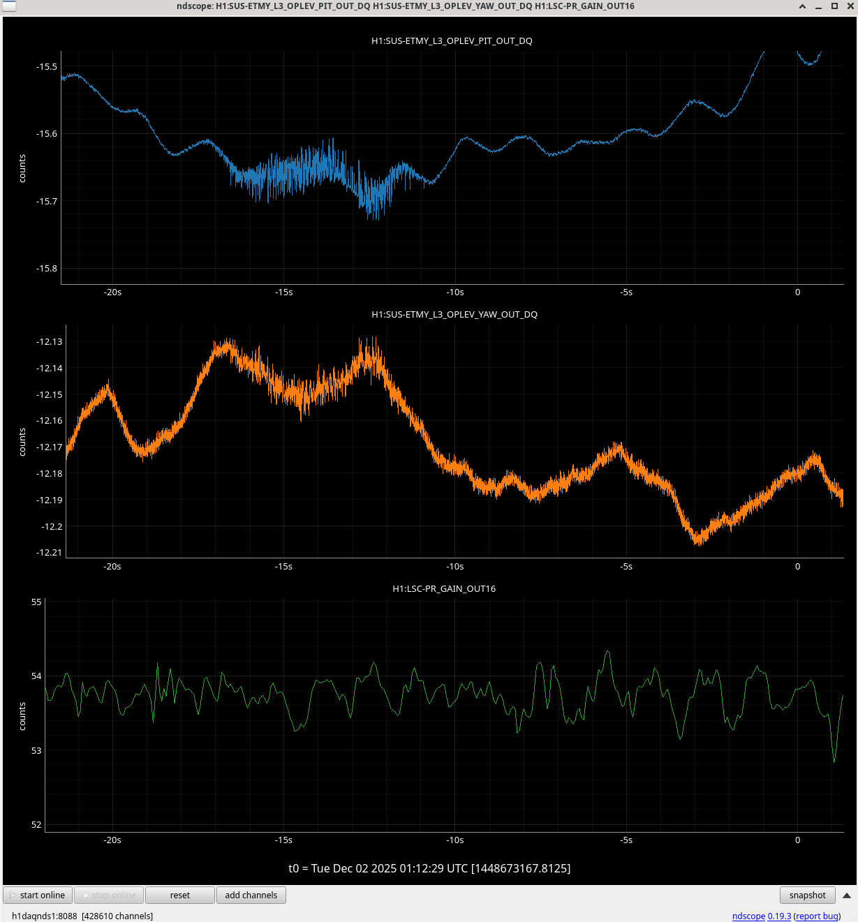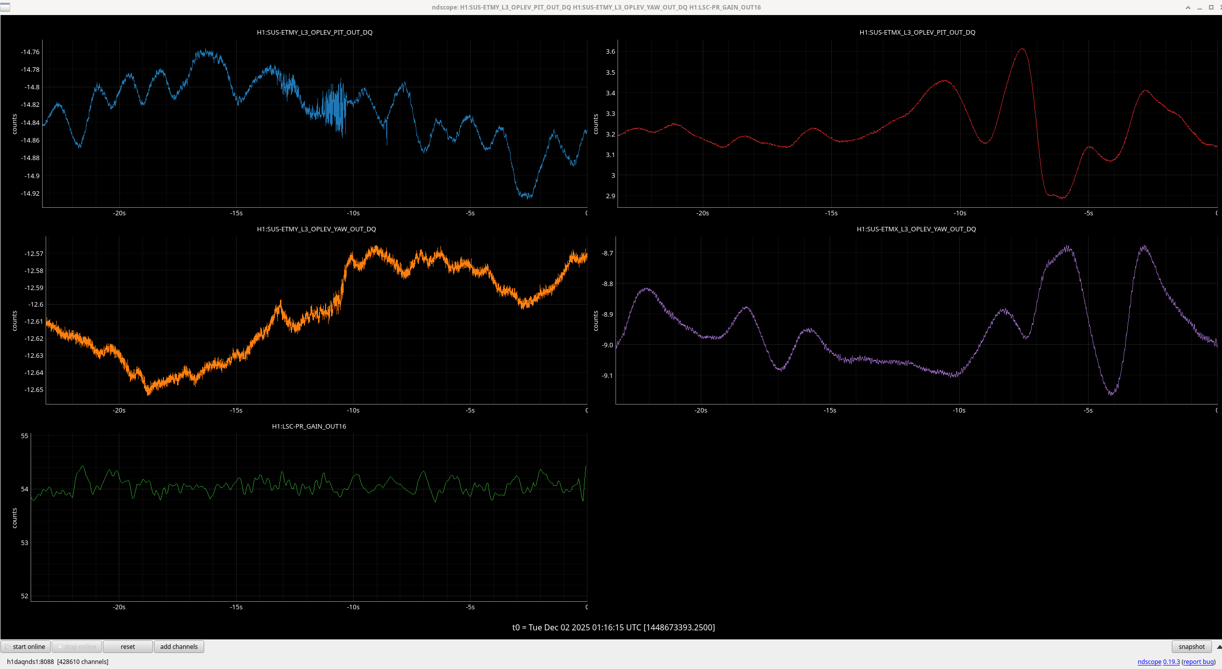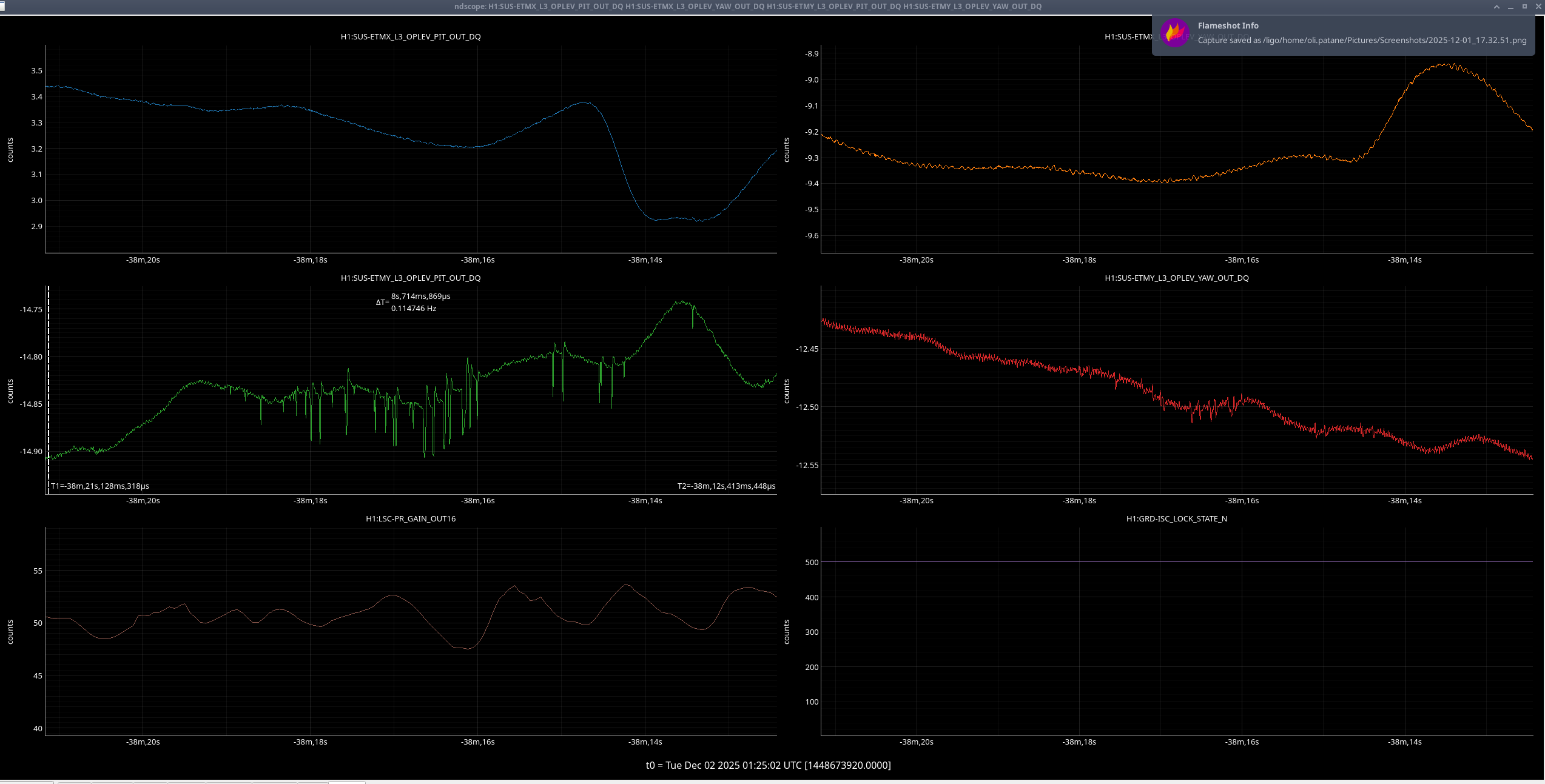 I'm intermittently, while we're locking, seeing some fuzziness on the ETMY oplev (first 2 attachments, with 'fuzzy'). Oli did a brief check, and while they find a different behavior that is present 4 days ago and today (3rd and 4th attachments, with 'drop'), at least a quick glance isn't finding the fuzziness that I'm seeing. We haven't looked at enough past data to say whether this is new, but it doesn't seem to be hindering our ability to lock, so I think we're fine to go forward with ETMX tomorrow.