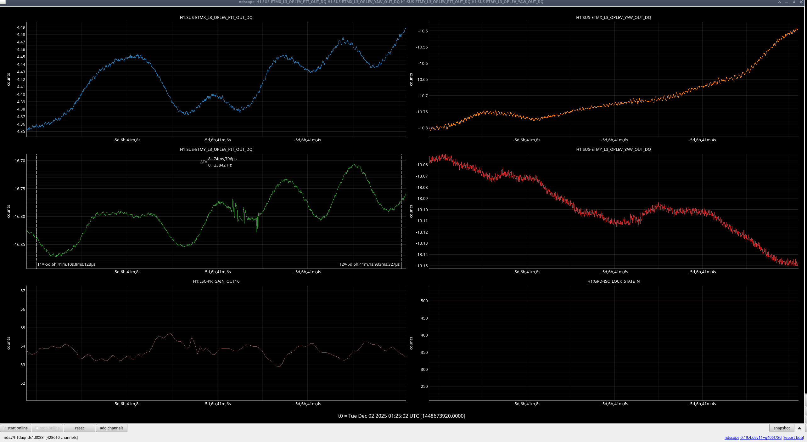 The squeezer guardian is stuck in LOCK_OPO. I tried once setting the SQZ_MANAGER to DOWN and again to FREQ_DEP_SQZ, but it's still not happy. Since this is not what we were trying to test today (we were just seeing if the Yend DAC swaps worked), I'm just leaving the SQZ_MANAGER in DOWN.
