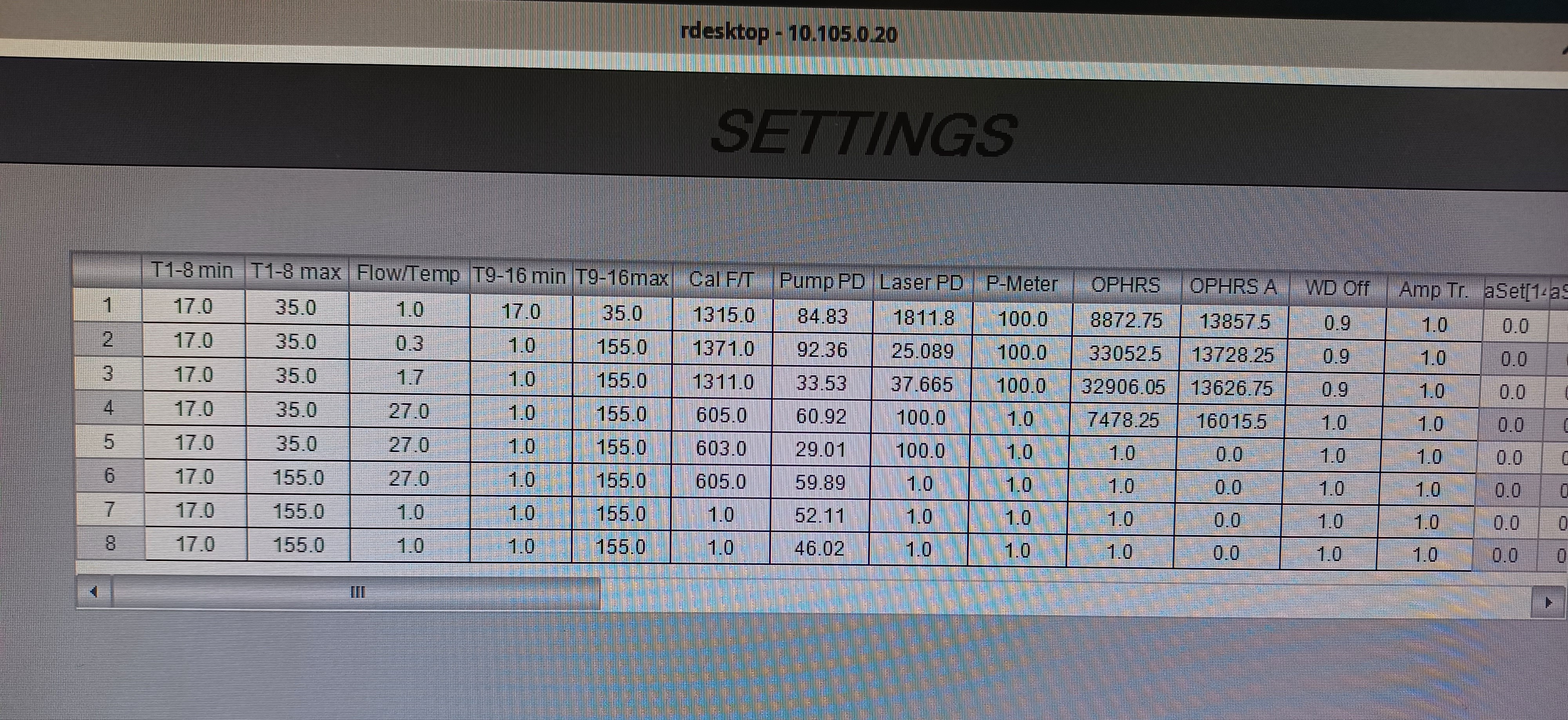 I've attached a picture of the Settings table for PSL sensor calibration and operating hours for future reference. Again, our persistent operating hours (that track total uptime of PSL laser components; OPHRS A in the attached picture) will continue to be wrong as we cannot update this value. The current operating hours, which tracks operating hours of currently operating components (i.e. we've been running this specific NPRO for X hours; OPHRS in the attached picture) are correct.