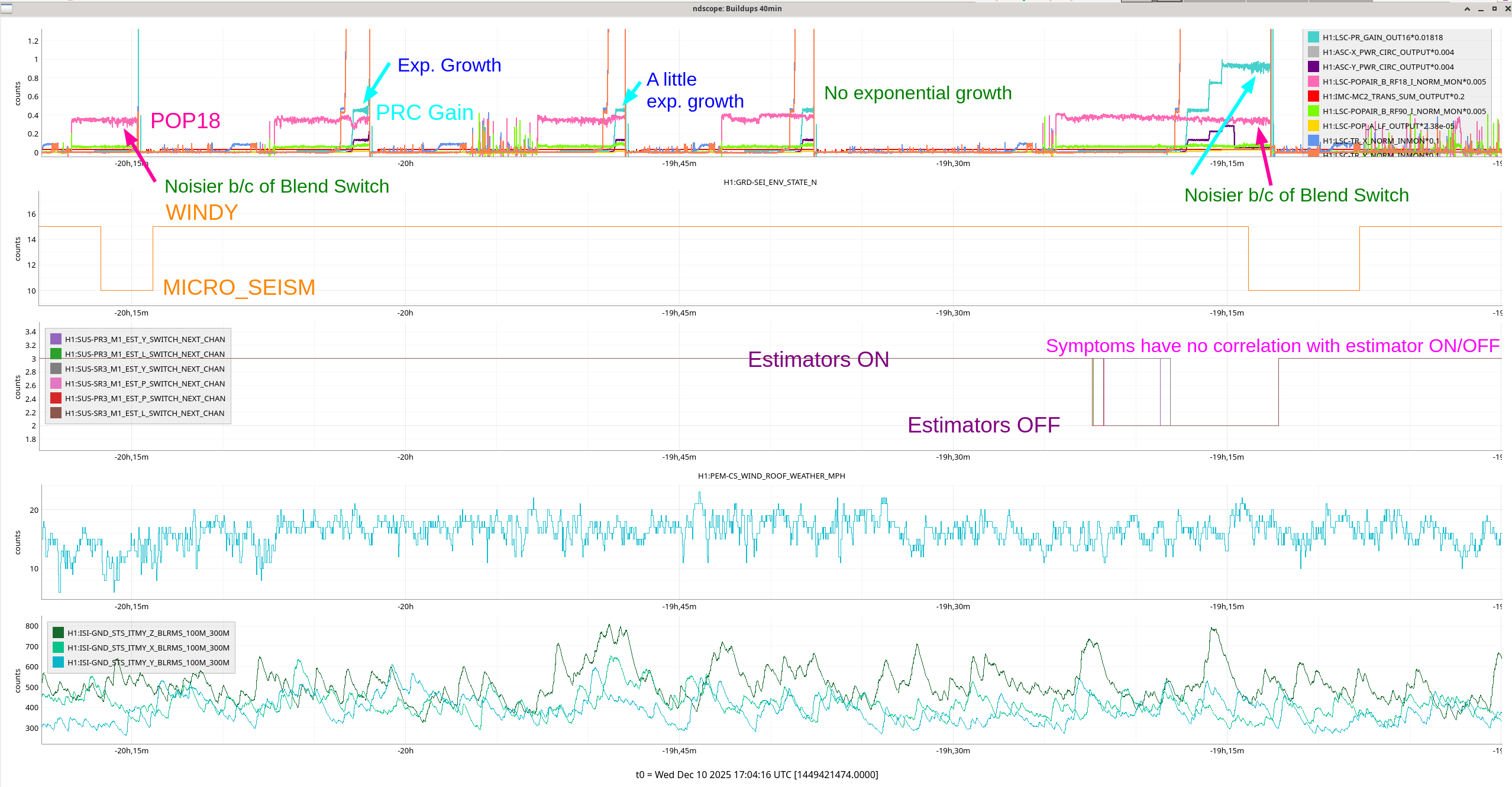 I'm pretty confident that the estimators aren't a problem, or at least a red herring. Just clarifying the language here -- "oscillation" is an overloaded term. And remember, we're in "recovery" mode from Last Thursday's power outage -- so literally *everything* is suspect and wild guesses are are being thrown on around like flour in a bakery, and we only get brief, but separated by 10s of minutes time, unrepeatable, evidence that something's wrong. The symptom was "we're trying 6 different things at once to get the IFO going. Huh -- the ndscope time-series IFO build ups as we're locking one time looked to exponentially grow to lock-loss in one lock stretch and in another it just got noisier halfway through this lock stretch. What happened? Looks like something at 0.6 Hz." We're getting to "that point" in the lock acquisition sequence maybe once every 10 minutes. There's an entire rack's worth of analog electronics that go dark in the middle of this, as one leg of its DC power failed. (LHO:88446) The microseism is higher than usual and we're between wind storms, so we're trying different ISI blend configurations (LHO:88444) We're changing around global alignment because we thing suspensions moved again during the "big" HAM2 ISI trip at the power outage (LHO:88450) There's a IFO-wide CDS crash after a while that requires all front-ends to be rebooted; with the suspicion that our settings configuration file track system might have been bad . (LHO:88448)... Everyone in the room thinks "the problem" *could* be the thing they're an expert in, when it's likely a convolution of many things. Hence, Oli trying to turn OFF the estimators. An near that time, we switch the configuration of the sensor correct / blend filters of all the ISIs (switching the blends from WINDY to MICROSEISM -- see LHO:88444). So -- there was - only one, *maybe* two where an "oscillation" is seen, in the sense of "positive feedback" or "exponential growth of control signal." - only one "oscillation" where it's "excess noise in the frequency region around 0.6 Hz," but they check if it actually *is* 0.6 Hz again isn't rigorous. That happens to be frequency of the lowest L and P modes of the HLTSs, PR3 and SR3. BUT -- Oli shows in their plots that: - Before vs. after the power outage, when looking at times when the ISI platforms are in the same blend state PR3 and SR3 control is the same. - The comparing the control request when the ISI platforms are in microseims vs. in windy show the expected change in control authority from ISI input, as the change in shape of the ASD of PR3 and SR3 between ~0.1 and ~0.5 Hz matches the change in shape of the blends. Attached is an ndscope of all the relevant signals -- our at least the signals in question, for verbal discussion later.