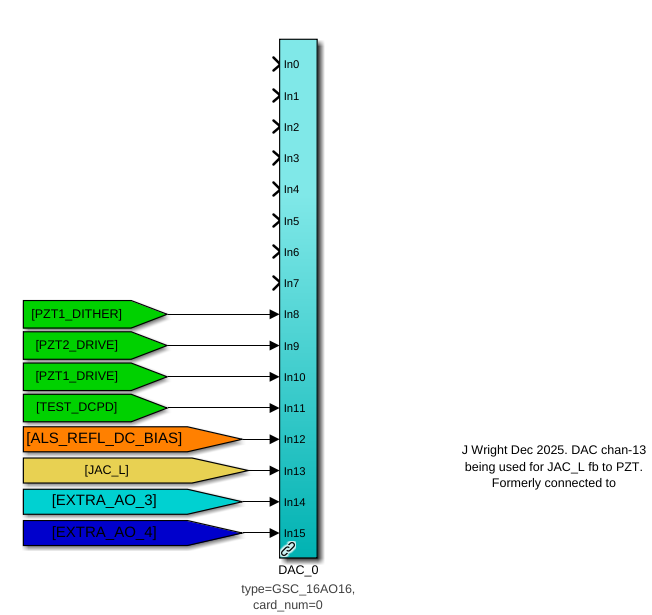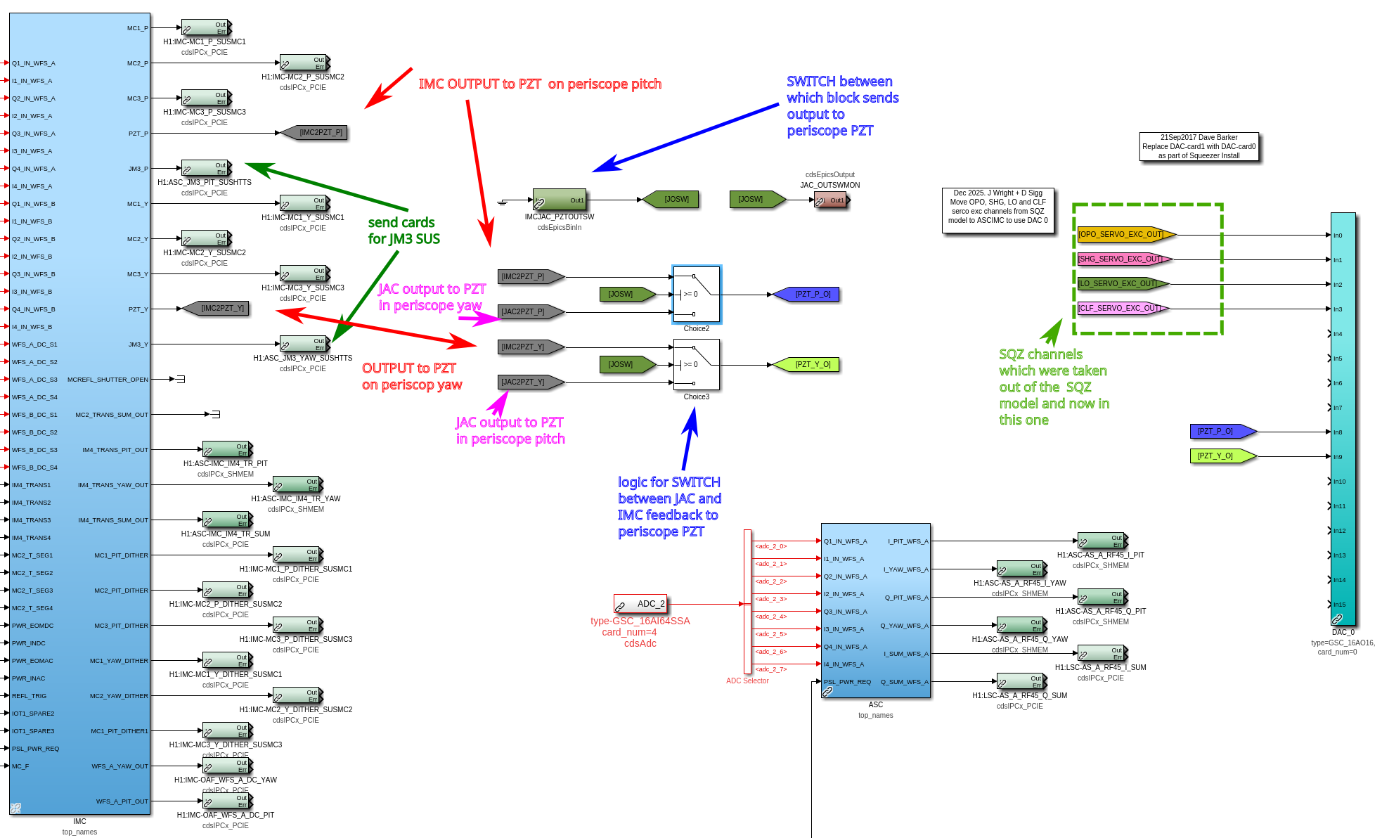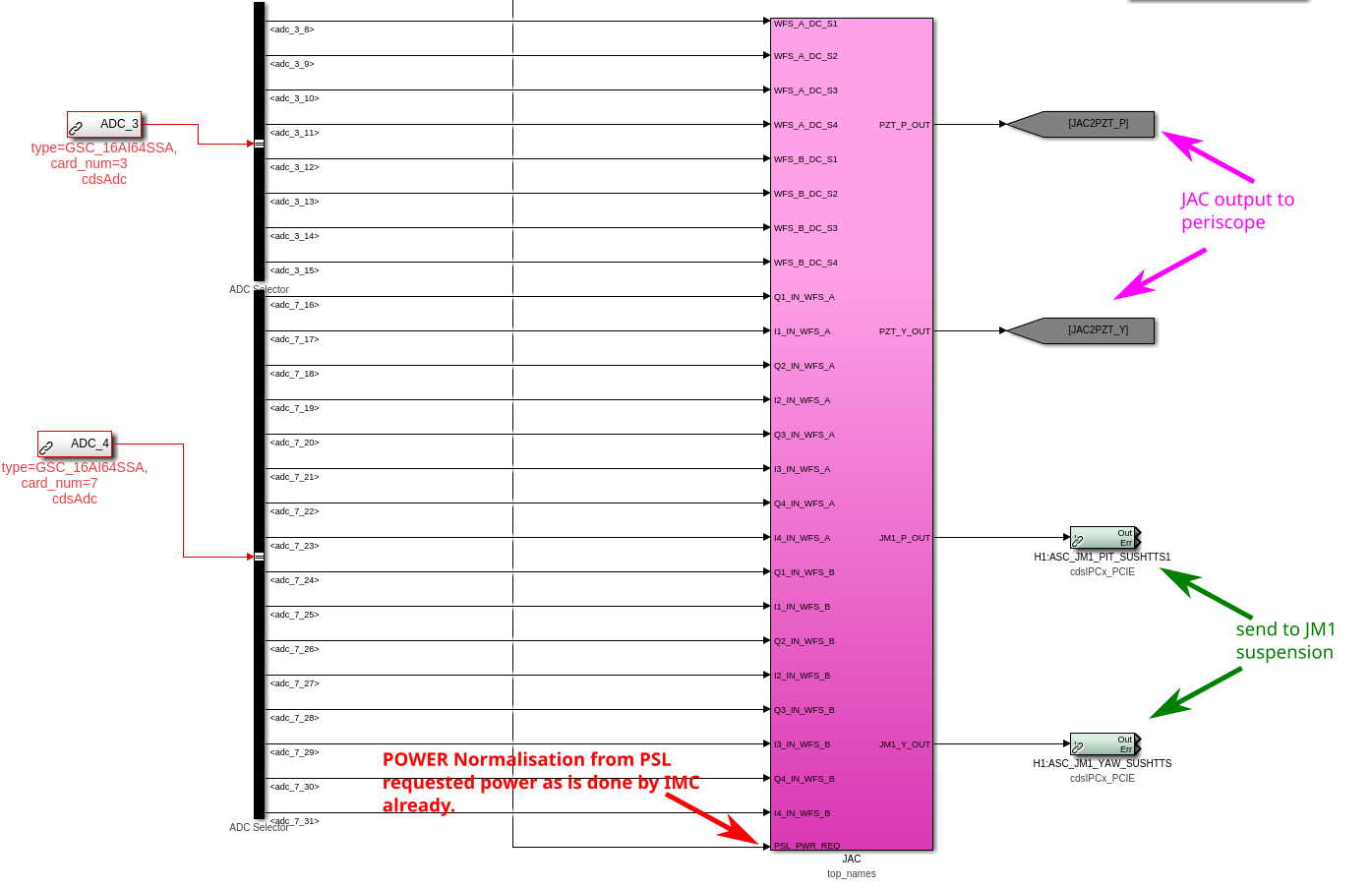 Today I finished doing the last round of changes to ascimc.mdl which adds a path to do ASC for the new jitter attenuation cavity, JAC. As part of this, the IMC will no longer be using the PSL periscope PZT as a feedback path to control input alignment and instead this path will be used to align to the JAC. We have implemented logic in the IMC ASC model to use the IMC as normal just now. We have also put in the infrastructure in this model for the JAC ASC in a JAC top_names block. The JAC has 2 WFS, 1 RF PD as input and feeds back to the PSL periscope and JM1 tip-tilt suspension for alignment. These changes were built and added to the re-locked revision in the svn.