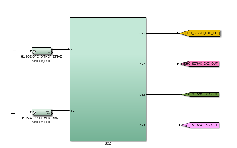 - two are sent from the SQZ model, H1:SQZ-OPO_DITHER_DRIVE and H1:SQZ-LO_DITHER_DRIVE, they go into a SQZ block.