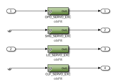 This block contains these filter banks, which we transferred from the h1sqz model. SHG_SERVO_EXC and CLF_SERVO_EXC have grounded inputs like they did the h1sqz model. The outputs are sent to the DAC0 channels highlighted with a green dotted line in this image of the h1ascimc model.