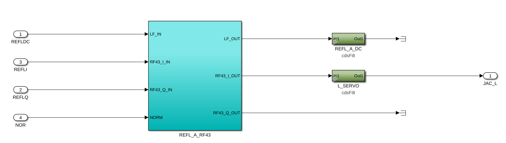The lower level contains a standard library REFL PD part but I removed the RF9 path and renamed the RF45 path to RF43 as this is the frequency we are using for the JAC control sidebands. There is also a block for reading out the low frequency signal 'REFL_A_DC' and a block for feedback filters 'L_SERVO'.