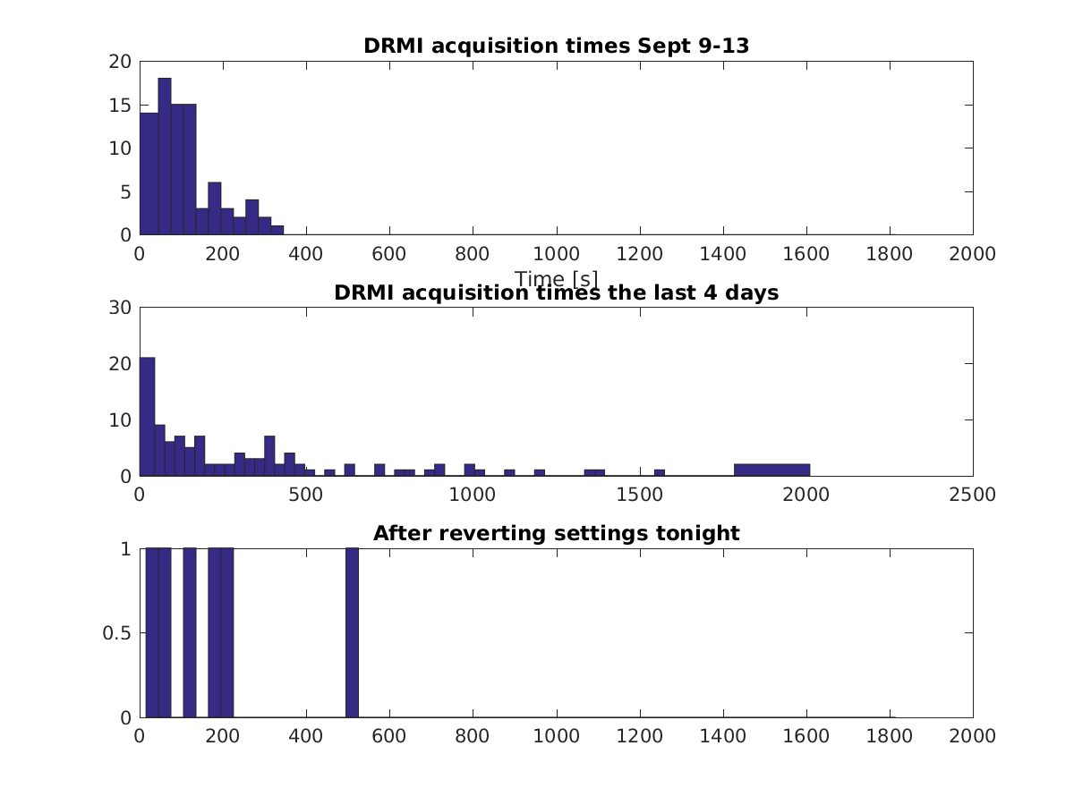 Summary: Since we have made many changes to DRMI over the last few weeks and locking is much slower than it was, I started trying to restore us to the old configuration which worked pretty well. We have locked DRMI 6 times since, none of the acquisitions have taken longer than 8 minutes. (see second attachment)