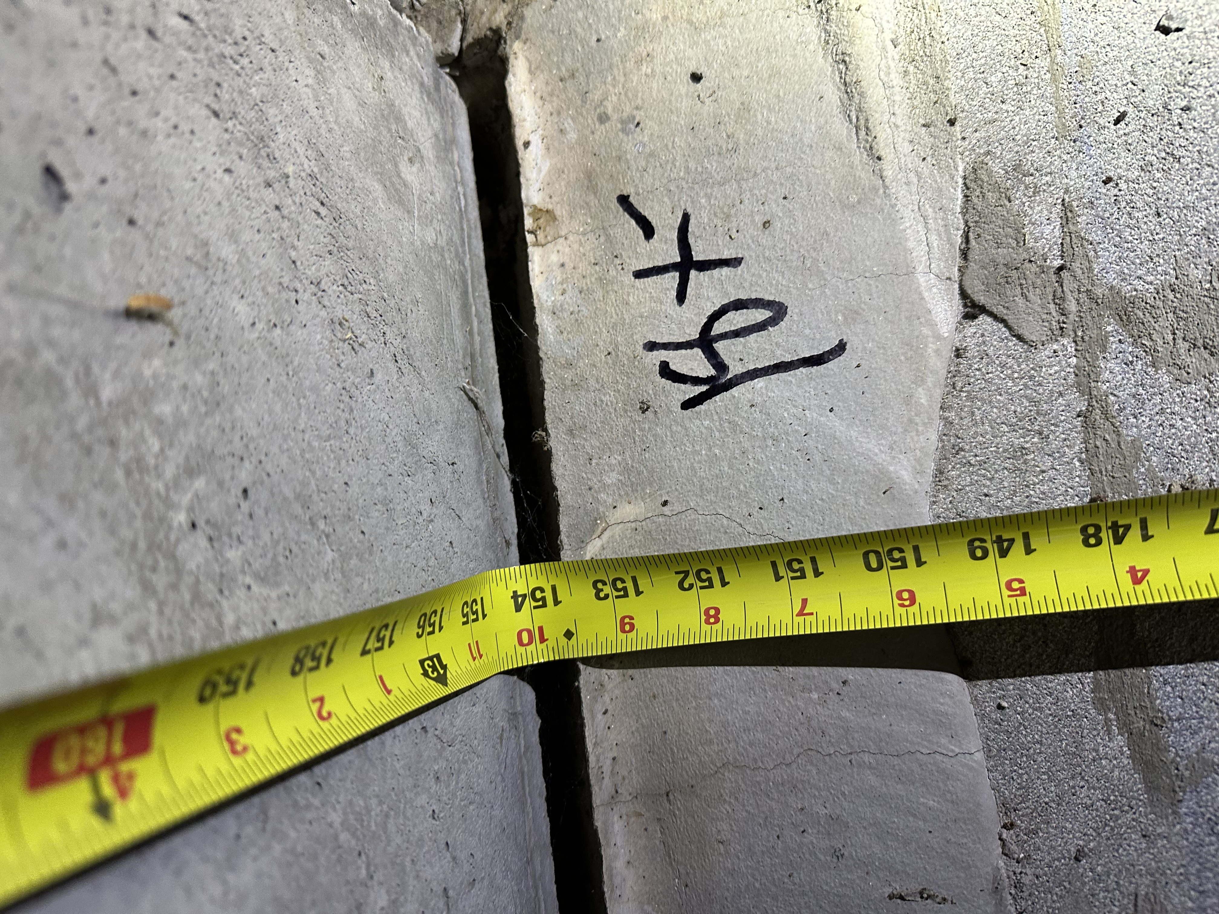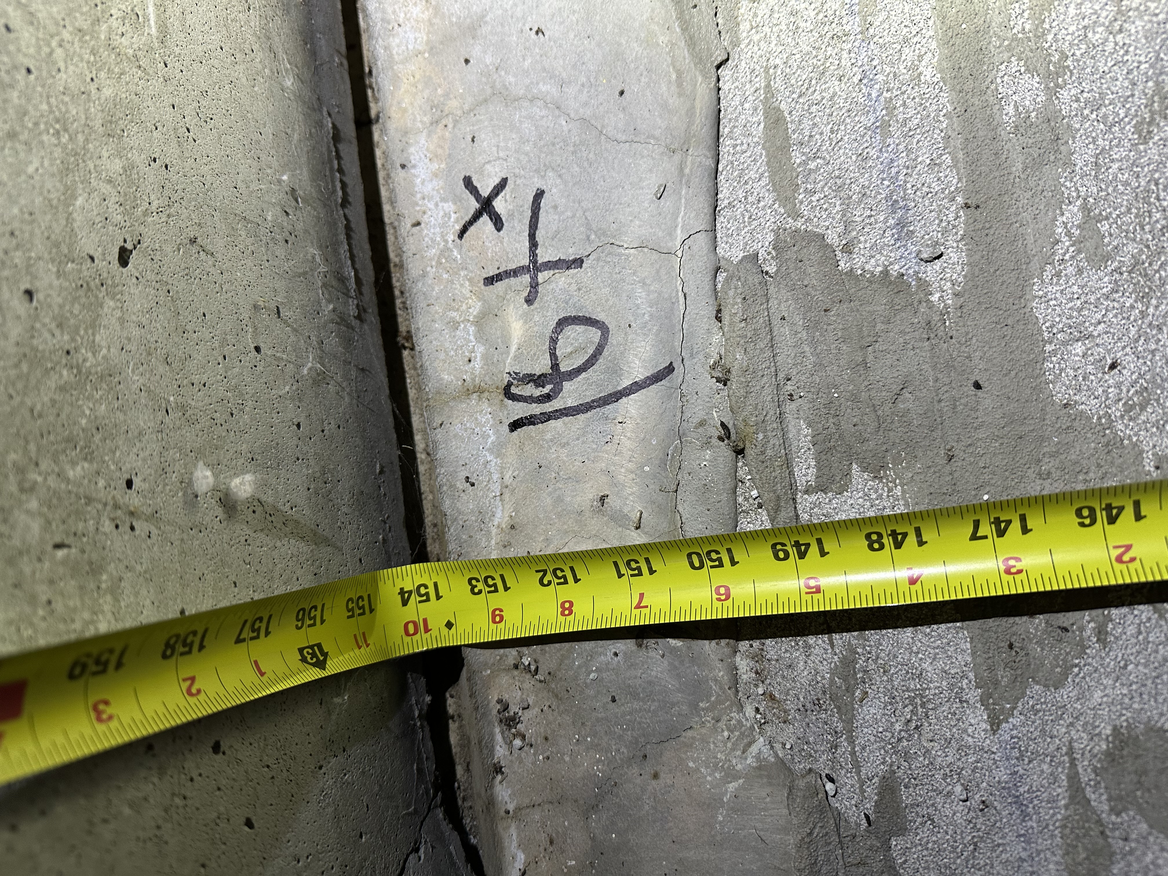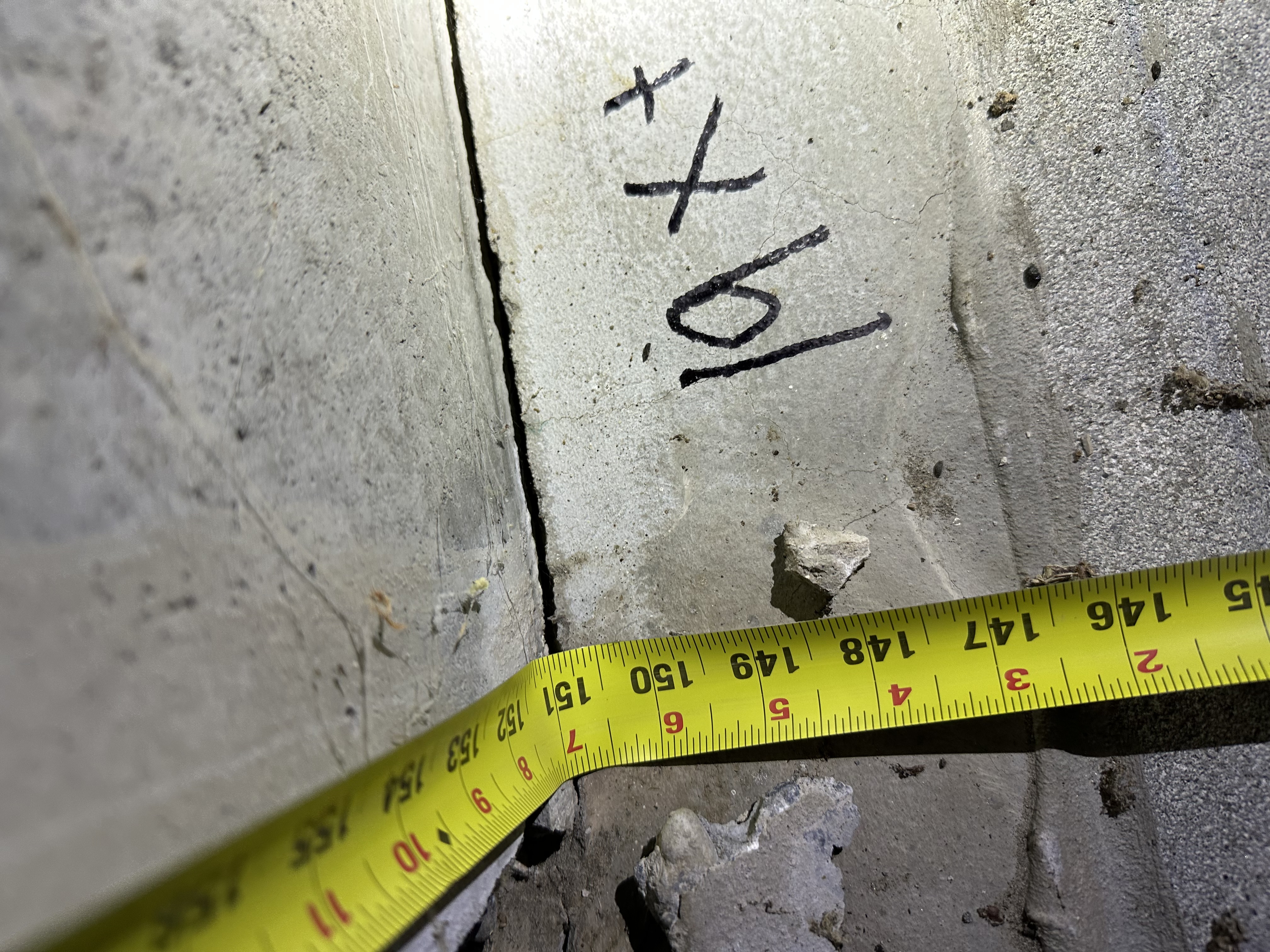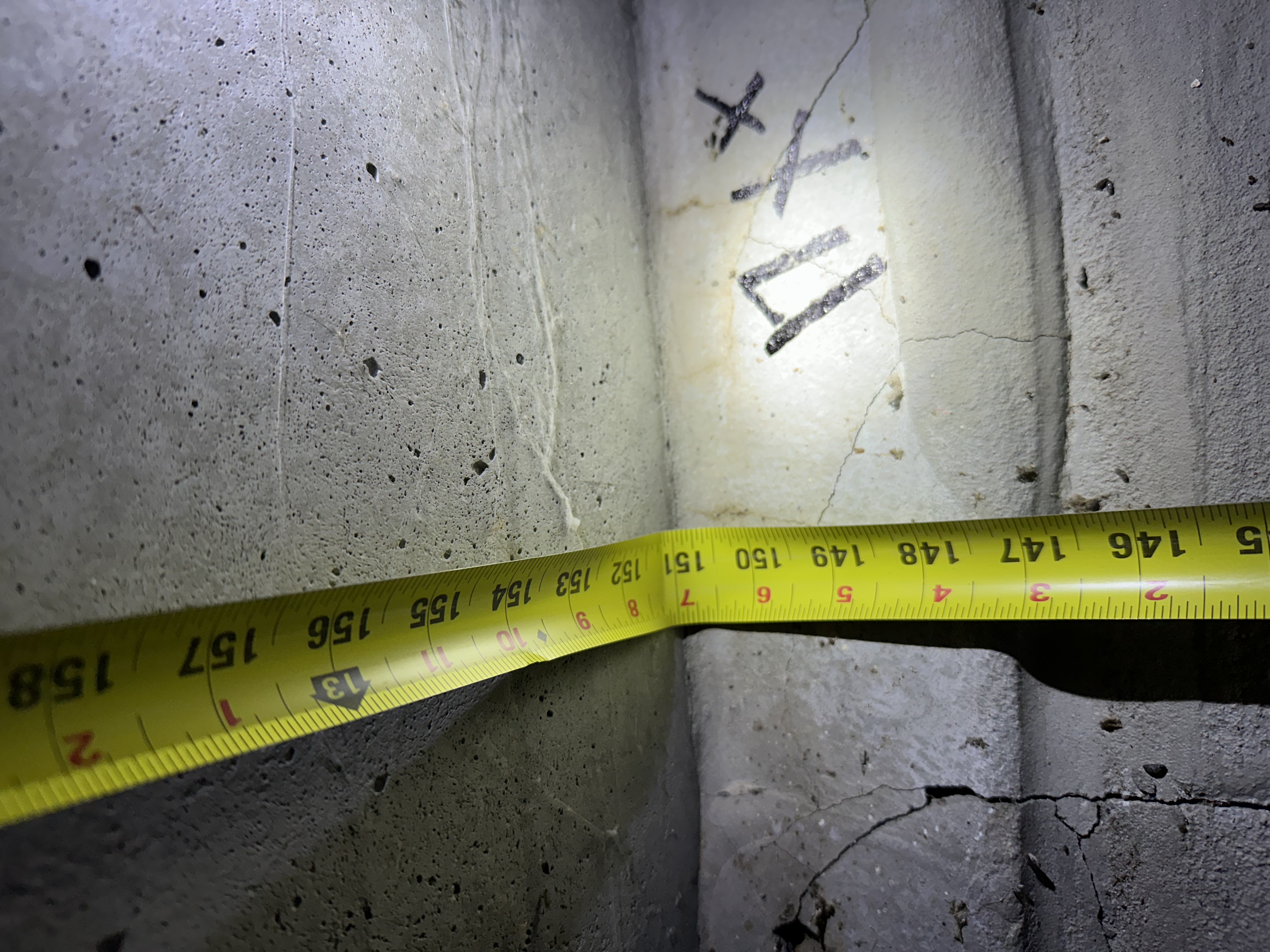 Following our influx of bees, M. Landry ordered an interior inspection of each beam tube enclosure (BTE) interior to document potential areas of ingress. R. Thompson with Apollo Mech is presently tasked with this inspection. During inspection of the X1 enclosure, roughly 5 sections -X of the X arm overpass, Randy observed cracking at the base of the interior of the enclosure. After further investigation he found 4-5 cracks running parallel of one another across the entire section at roughly the 10 & 2 o'clock positions. I was called to come give this section a second look. The cracks were also immediately concerning to me. The first thing I wanted to better understand was the interior width to assess if the section was shifting. With Randy's help, I measured the interior spans of each end of the neighboring tube sections (4 measurements) as well as an additional 4 of the same spans of the tube sections on display outside of the LExC. On average, these spans measure 151" +/- .25". The section in question measures 154" at each end. Moreover, during installation Fred Raab has informed us that grouting was done on the BTE interiors to mitigate a "walking" effect that was causing misalignment between sections. This grouting has clearly separated from the BTE interior which confirms that there is in fact splaying of this section. The current short term "fix" implemented by FAC and VAC has been the erection of scaffolding topped with planking across the 10' area of beam tube at risk of falling debris. This should act as makeshift roof. For the long term, R. McCarthy is currently consulting with structural engineers whom we hope can help us work up a solution to prevent further splaying. Contained in the photos attached are measurements with appropriate labeling of each section (number counted from second door on X1 traveling -X), as well as a "+X" or "-X" which simply denotes if the measurement is on the +X or -X end of the tube section, photos illustrating the separation of the BTE interior from the as-installed BTE grouting, the scaffolding presently in place, the cracking at the footing/mid sections, and a LIGO Yelp review written in welders soapstone (circa ~96') near the splayed tube section. C. Soike, E. Otterman, T. Guidry, G. Moreno, T. Sadecki, J. Vanosky, R. McCarthy