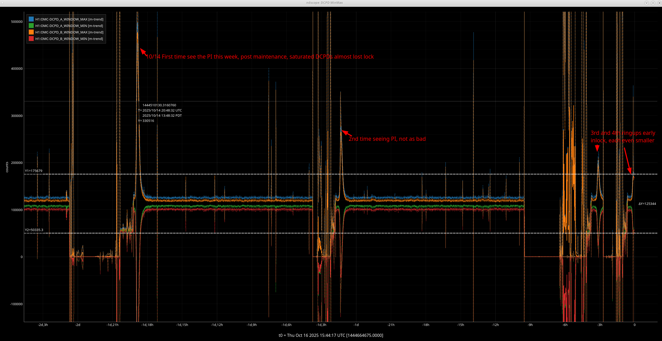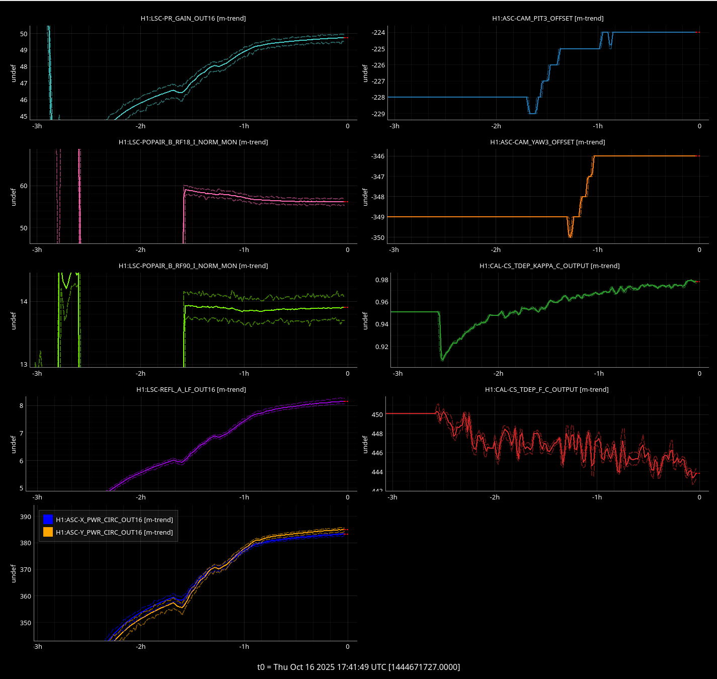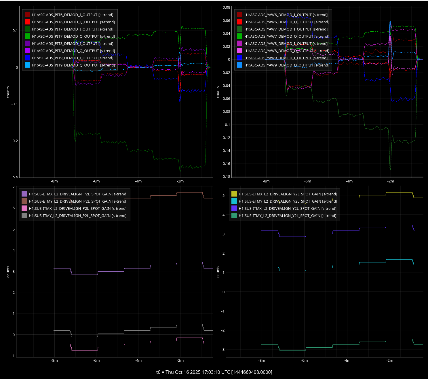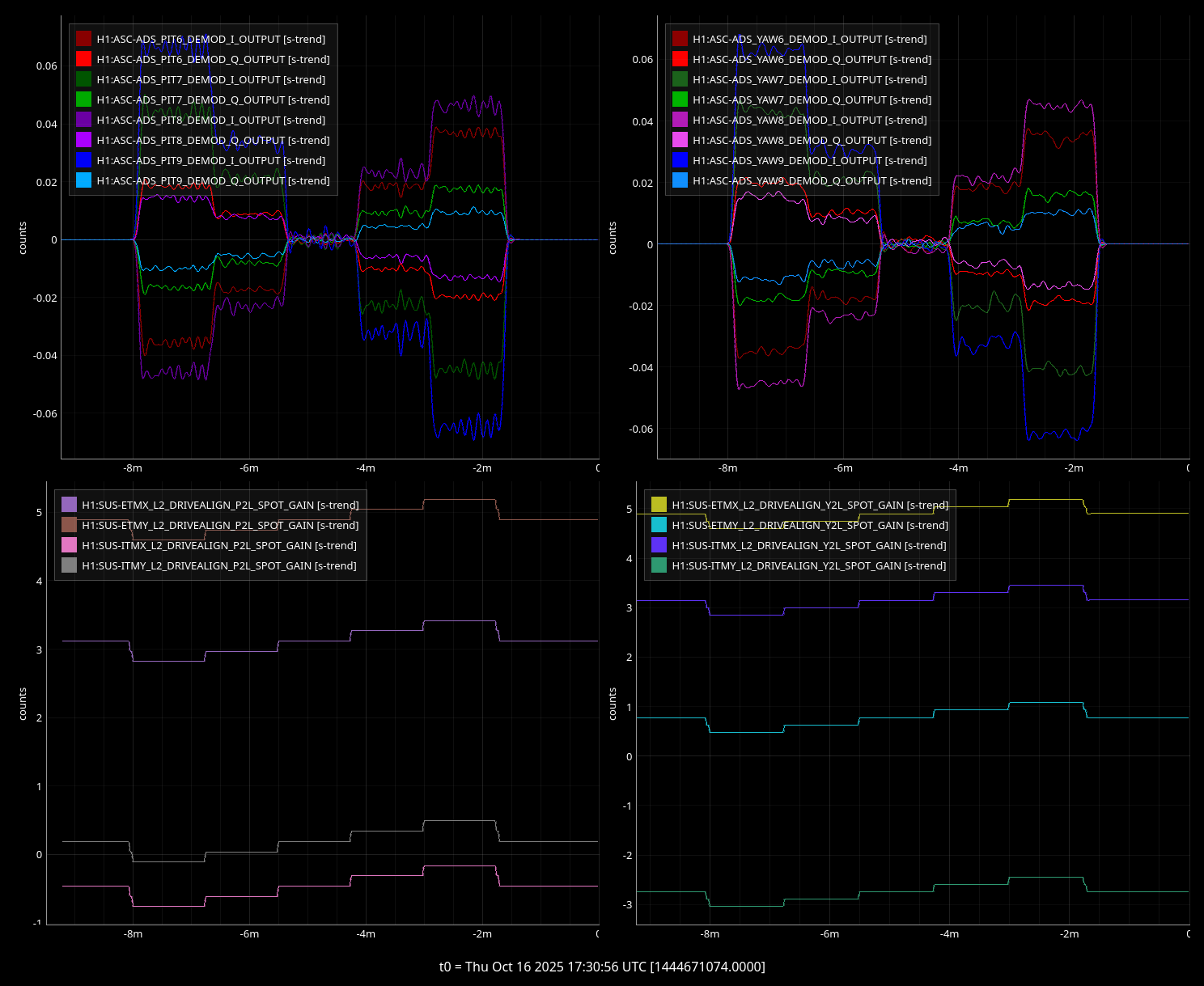 Instead of considering the A2L gains or ADS, I just chose to move the spot around by hand to make the buildups better. I did so slowly in pitch and then in yaw. Overall, the final camera offsets are P: -224 and Y: -346. This offsets brought the PRG up to 49.5 and the arm powers up to 380 "kW". I also noticed that this change brought the Y arm power up slightly about the X arm power, which is how it used to be before whatever happened on Tuesday.