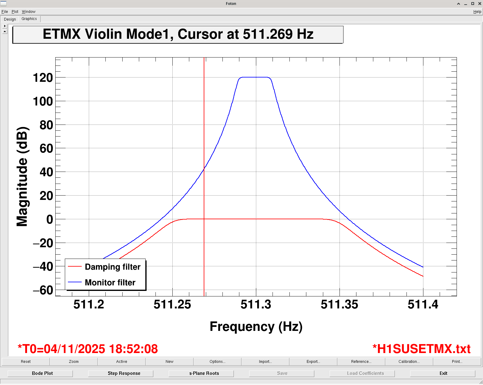 Also shown is the ETMX mode 1 monitor and damping filters, showing that as Elenna said the monitor filter seems to only catch the 'true' mode, while the damping filter is broad enough for both of these frequencies.
