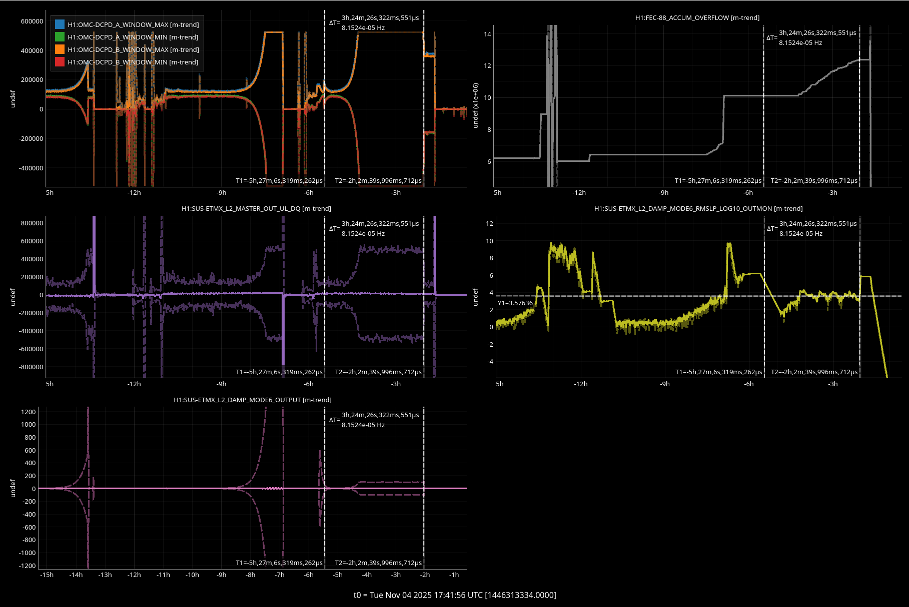 03:45 UTC Something started to ring up in the DCPDs and the 500Hz line looked large on DARM. None of the vioins were ringing up though, I eventually found that both ETMY and ETMX (mostly ETMX) mode1/6's drive was ringing up and once I turned off the damping the DCPDs came back down and so did the line on DARM. (tagging SUS). I then put the nominal gain back into ETMX mode6 and it started to damp back down.