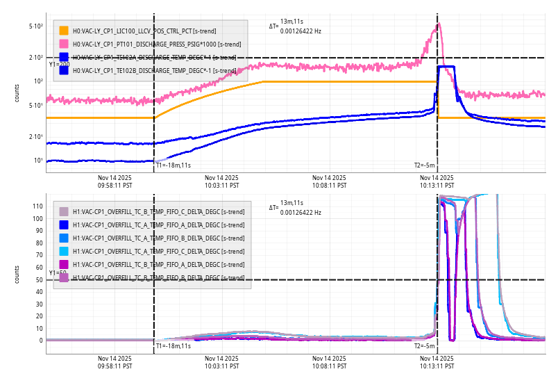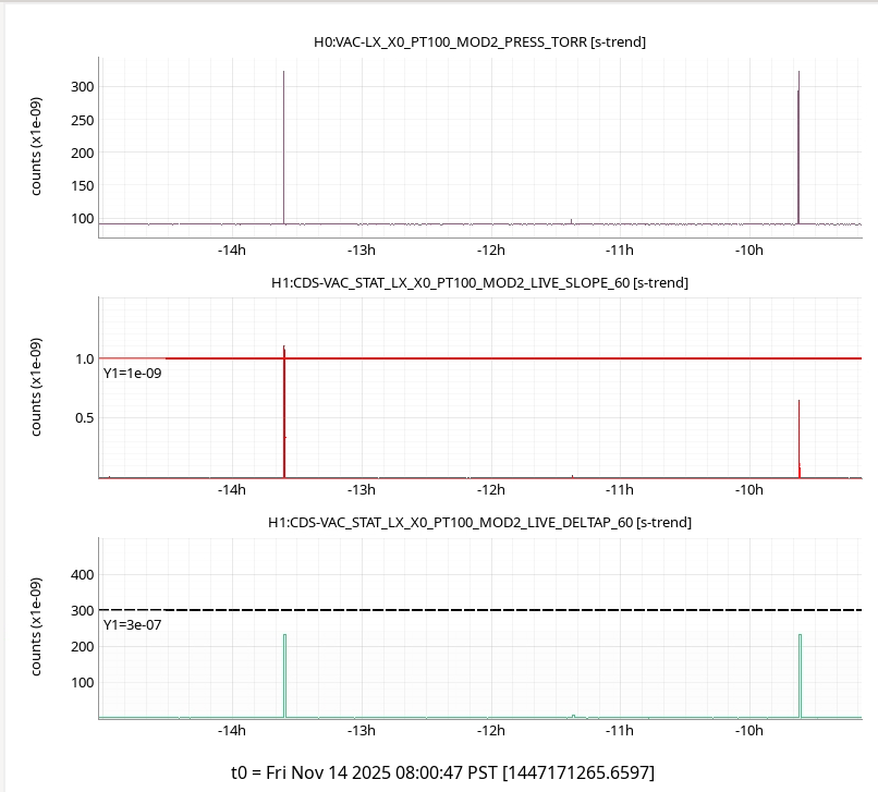 We had a couple of HAM1 vacuum glitches yesterday evening (Thursday 13th November 2025) at 18:24 and 22:24 PST. The first glitch caused a VACSTAT alarm because its slope just exceeded the 1.0e-09 torr/min trip level, the second did not reach this level.