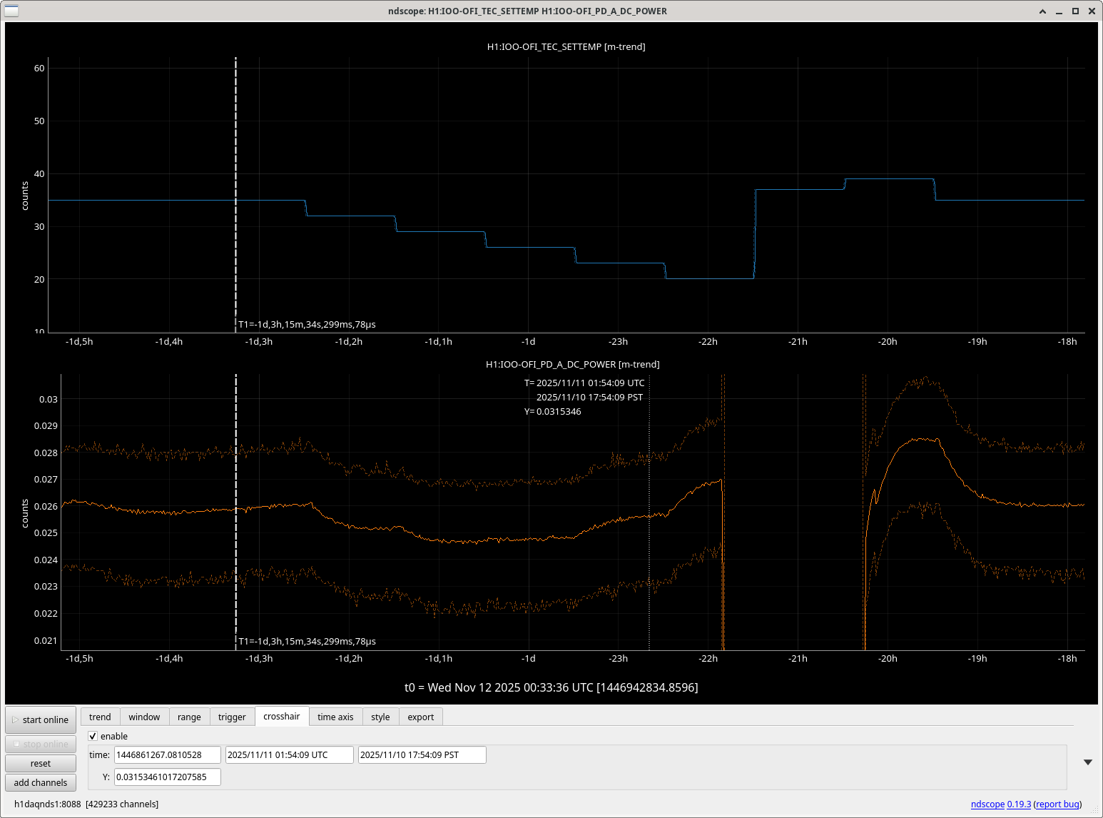 In 88046 the OFI temperature slowly scanned while we were in observing, we lost lock while the temperature was still scanning but we got through the minimum of power sent to HAM7.