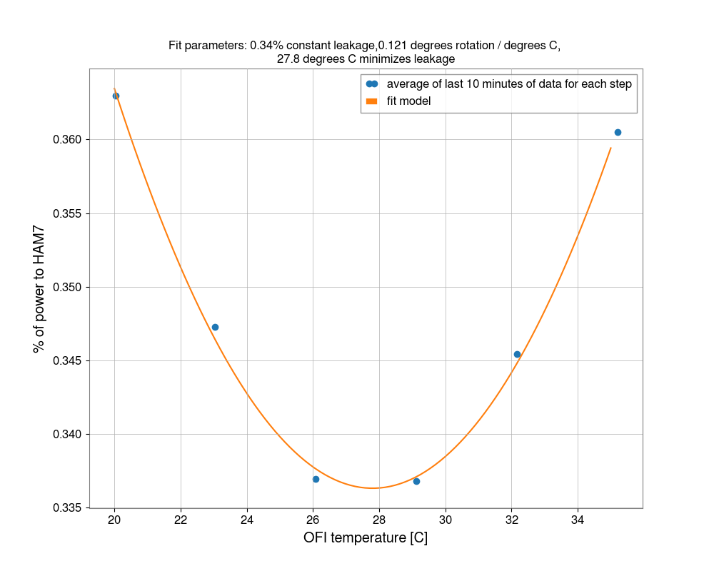 In the third attachment, the blue dots are averages of the last 10 minutes at each OFI temperature. This is fit to a model for the constant leakage, temperature coefficient and temperature that minimizes leakage: leakage ratio = constant_leakage + 1* sin^2( (pi /180 )* angle_coefficent * (temp - best_temp)
